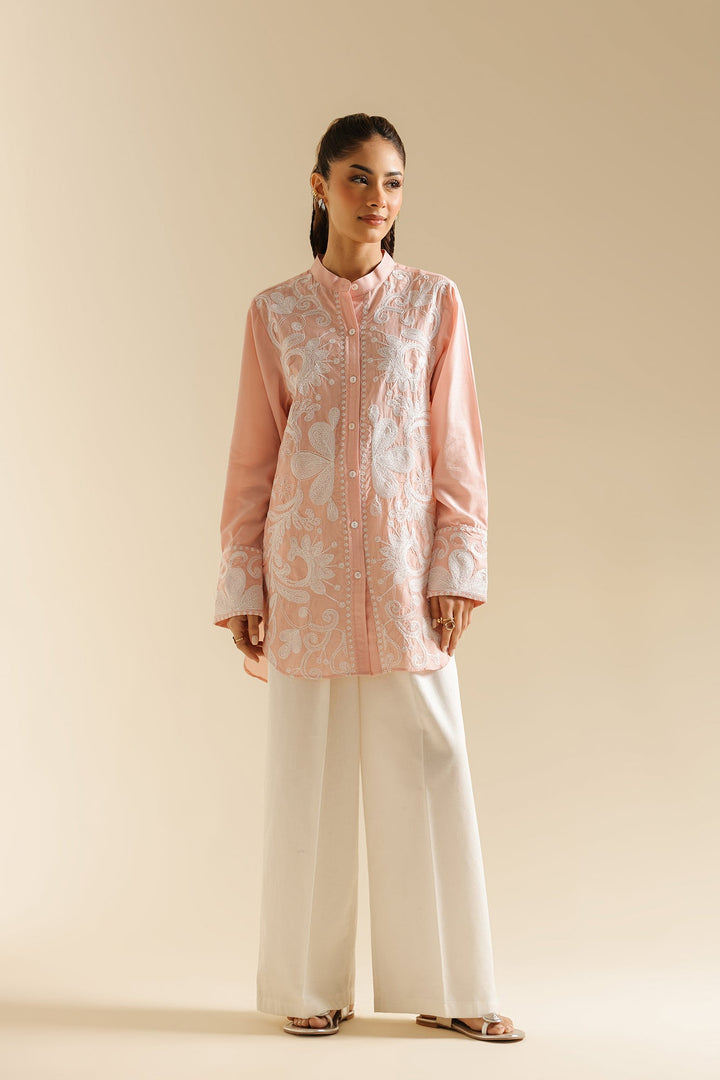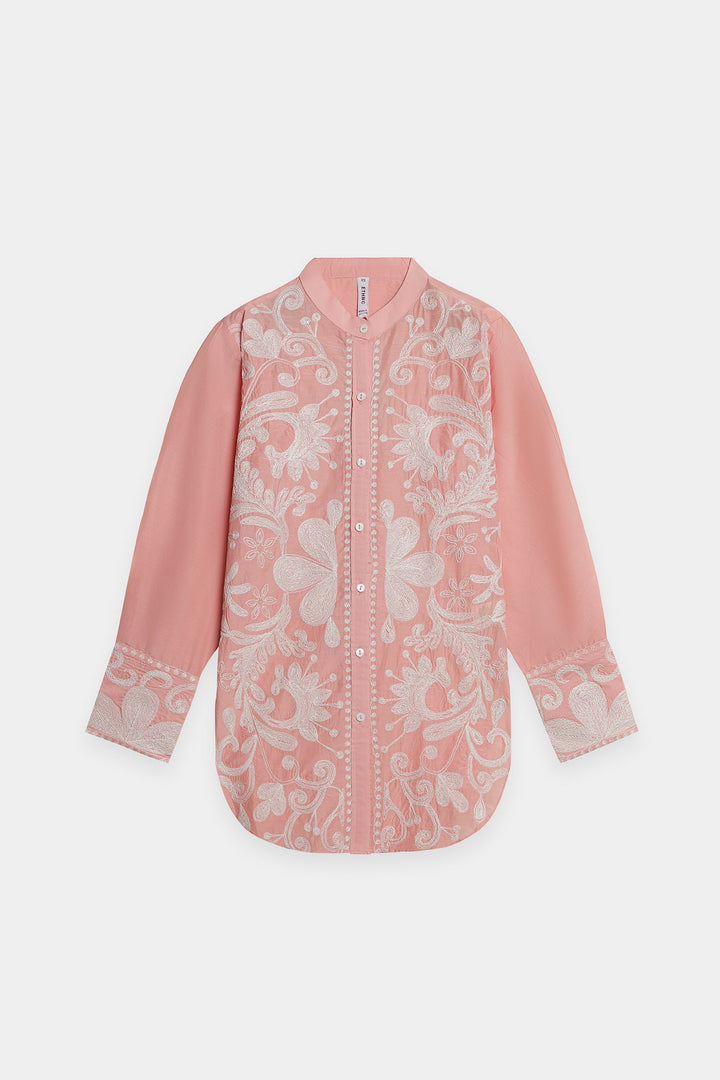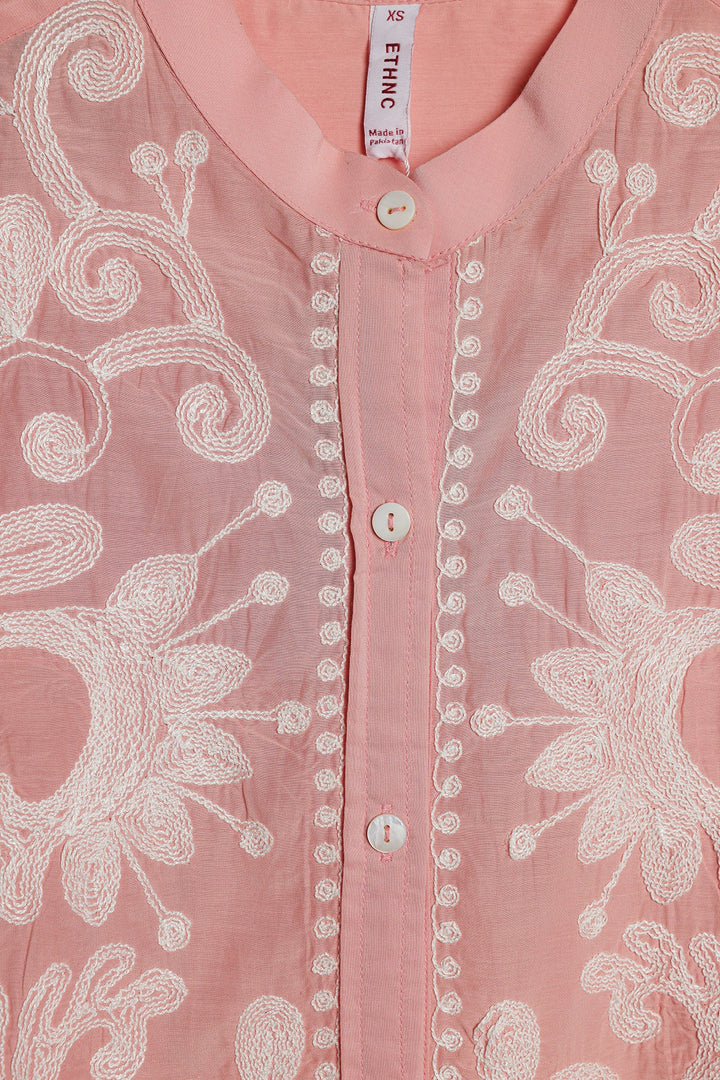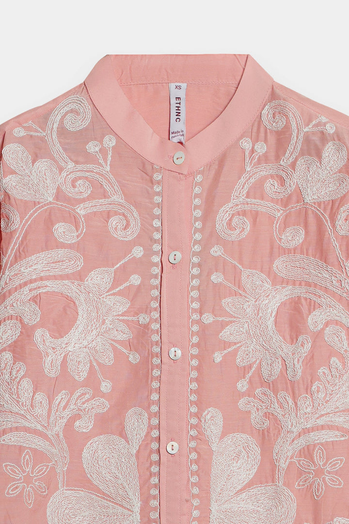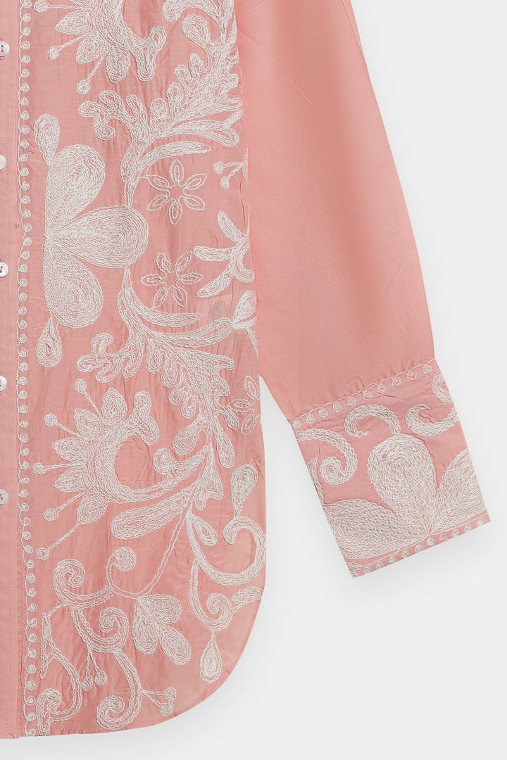 Dress in sophistication with this beautiful pink embroidered top. This elegant button-down shirt features intricate white floral embroidery, creating a striking and delicate pattern across the front, back, and sleeves. The design combines a classic silhouette with graceful detailing, making it perfect for a semi-formal event or a stylish day out.
