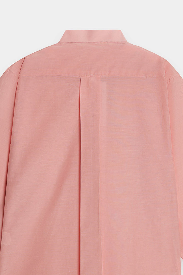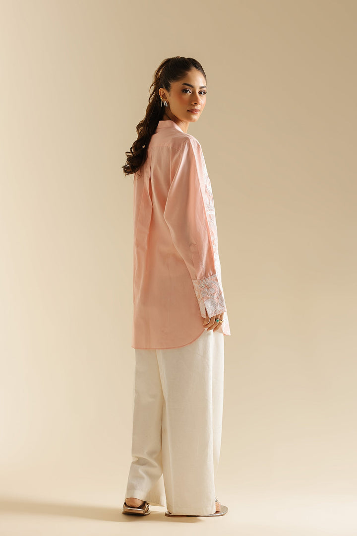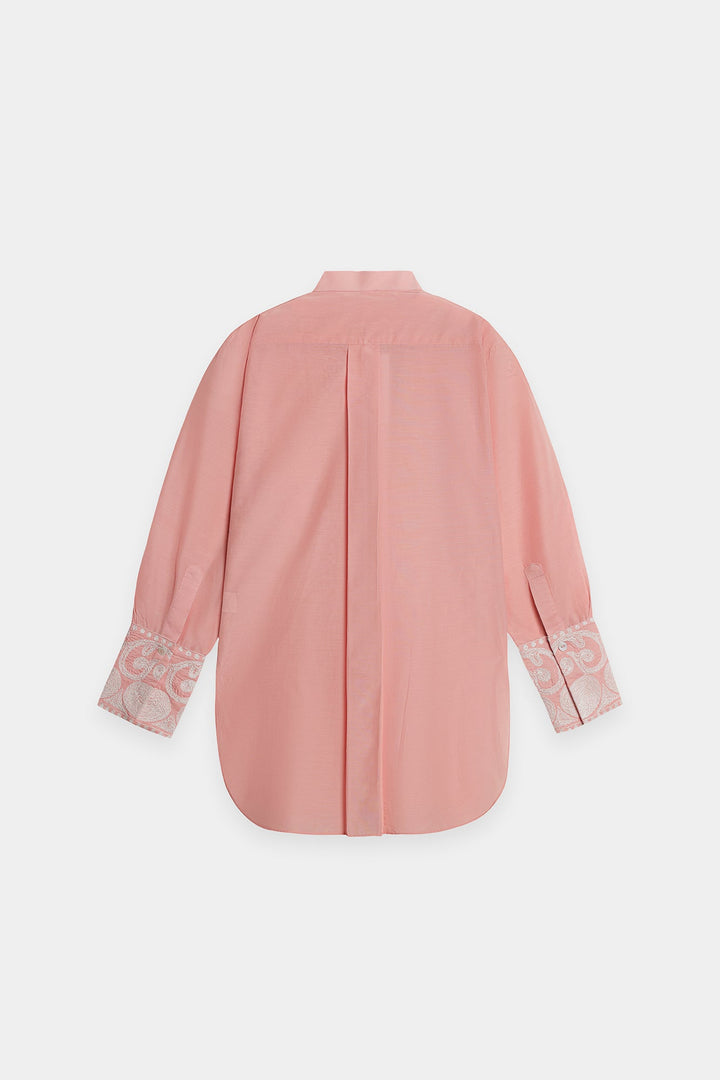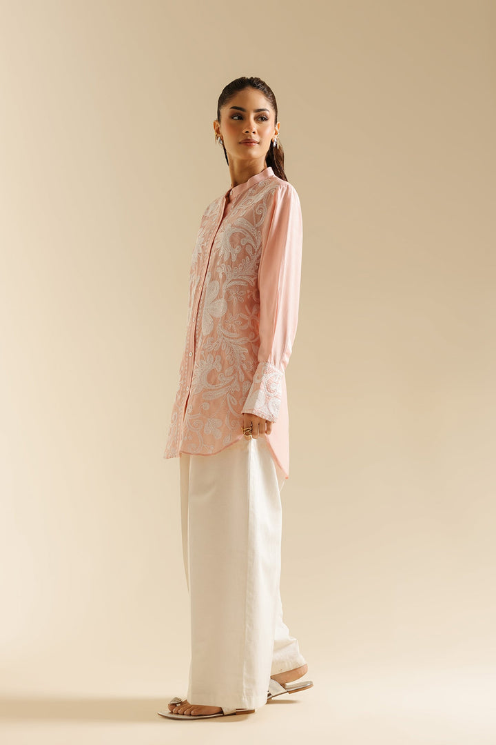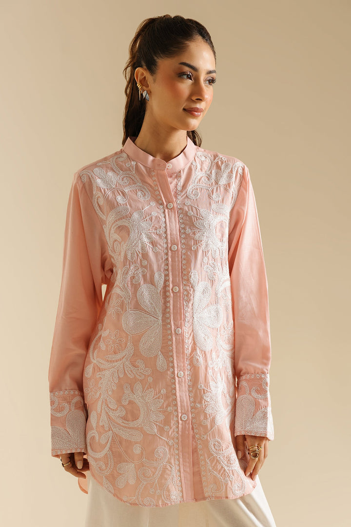 Dress in sophistication with this beautiful pink embroidered top. This elegant button-down shirt features intricate white floral embroidery, creating a striking and delicate pattern across the front, back, and sleeves. The design combines a classic silhouette with graceful detailing, making it perfect for a semi-formal event or a stylish day out.