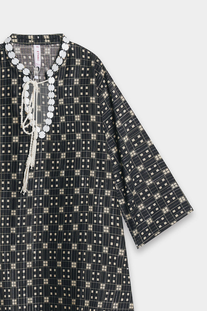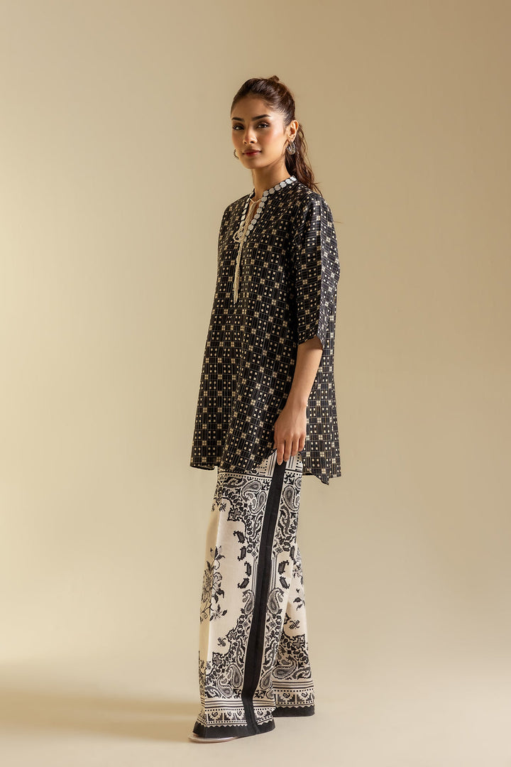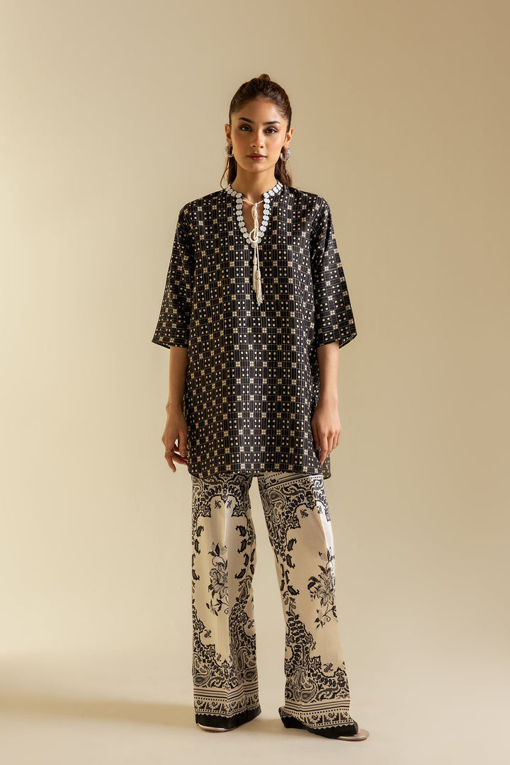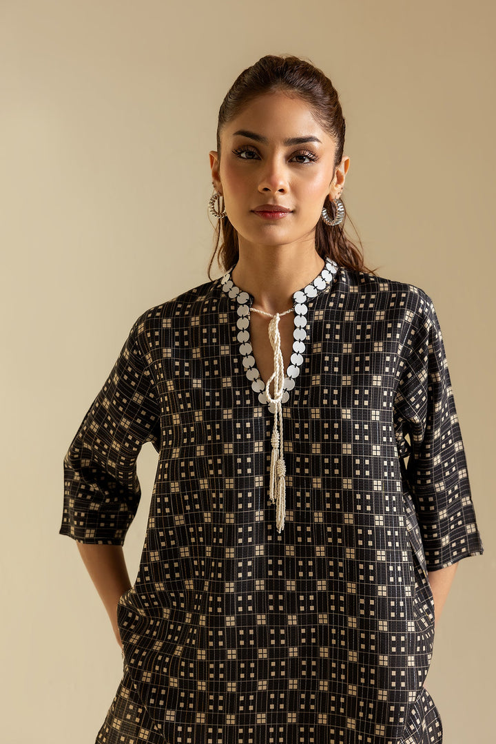 Embody grace and sophistication in this elegant top, featuring a classy black shade. The contemporary silhouette is adorned with stunning geometric pattern prints in contrasted beige hues and enhanced with sequins embellishments at neckline. This classy top is a must-have for stylish fun at any occasion this season.