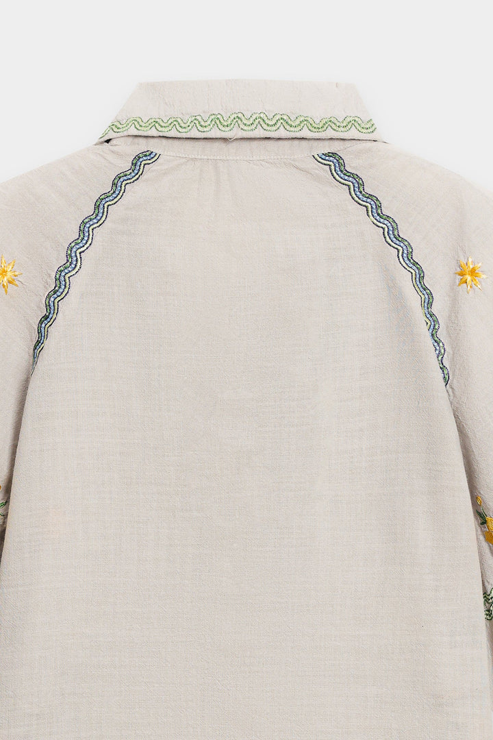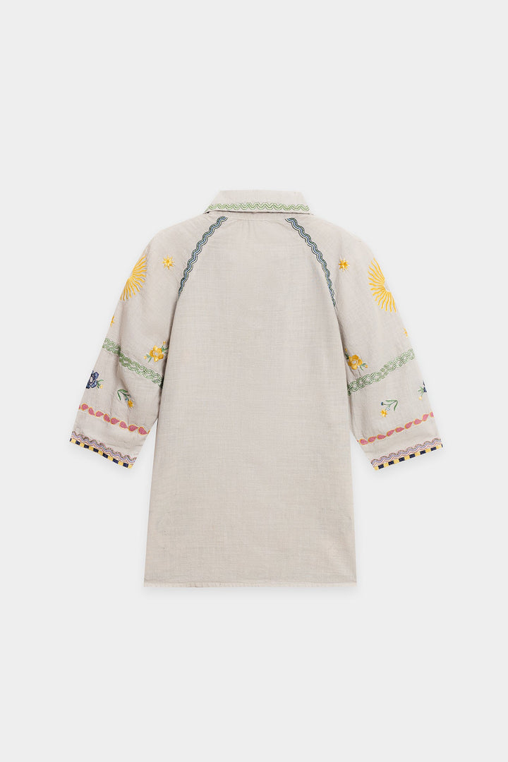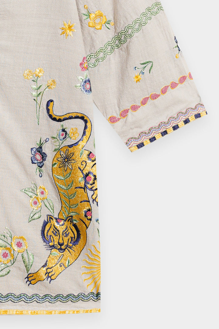 Make a statement in this exquisite embroidered top. The light grey shirt features intricate and colorful embroidery, with a striking design of two tigers on the front, surrounded by a delicate floral and sun motif. The detailed stitching extends to the collar and sleeves, creating a unique and artistic look. With its relaxed fit and vibrant pattern, this top is a standout piece that adds a touch of bohemian flair to any outfit.