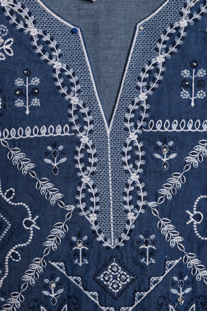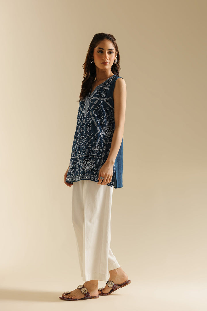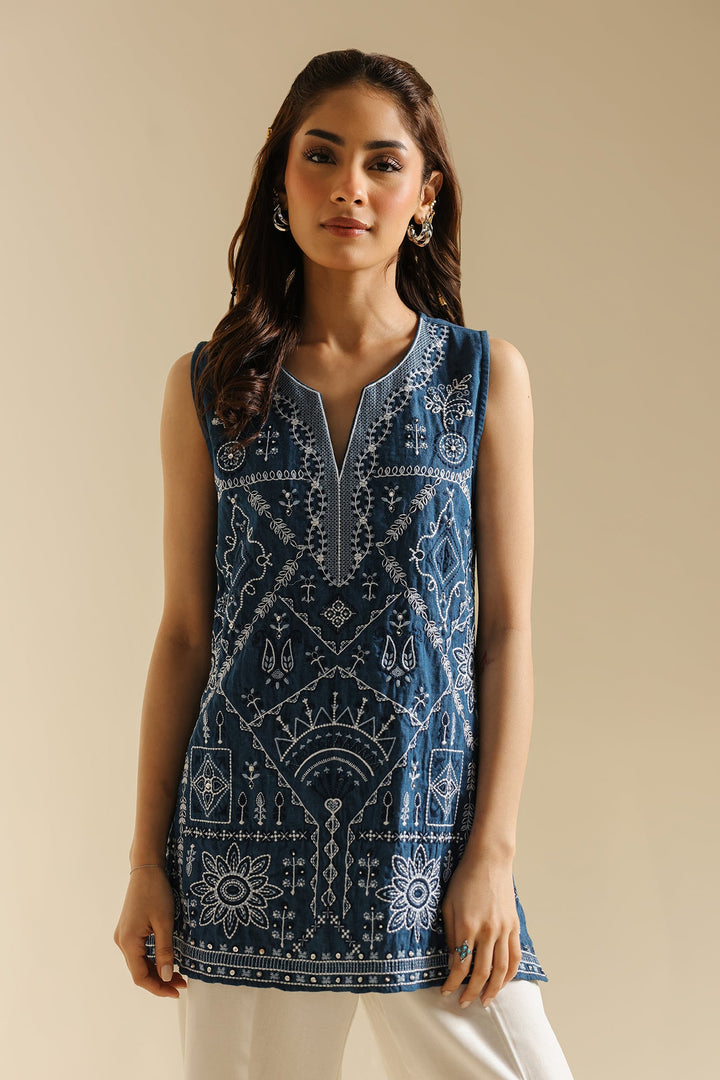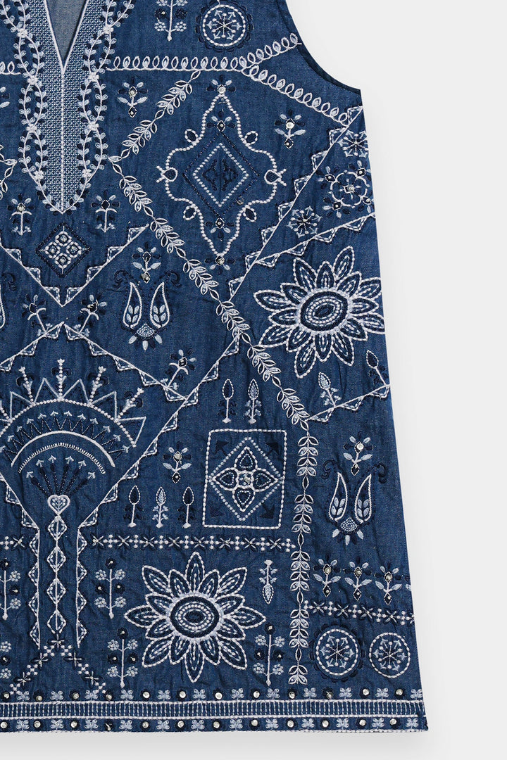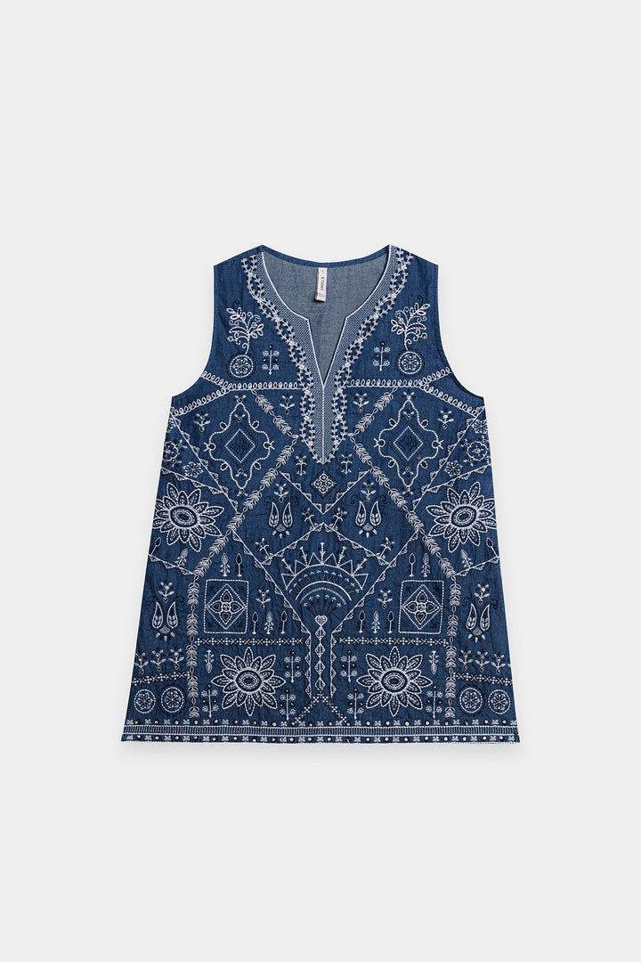 Feel chic and confident in this stunning blue embroidered sleeveless top. This unique piece features intricate white floral and geometric patterns, creating a beautiful contrast against the blue fabric. The relaxed fit and elegant design make it a versatile addition to your wardrobe, perfect for a day out or a special occasion.