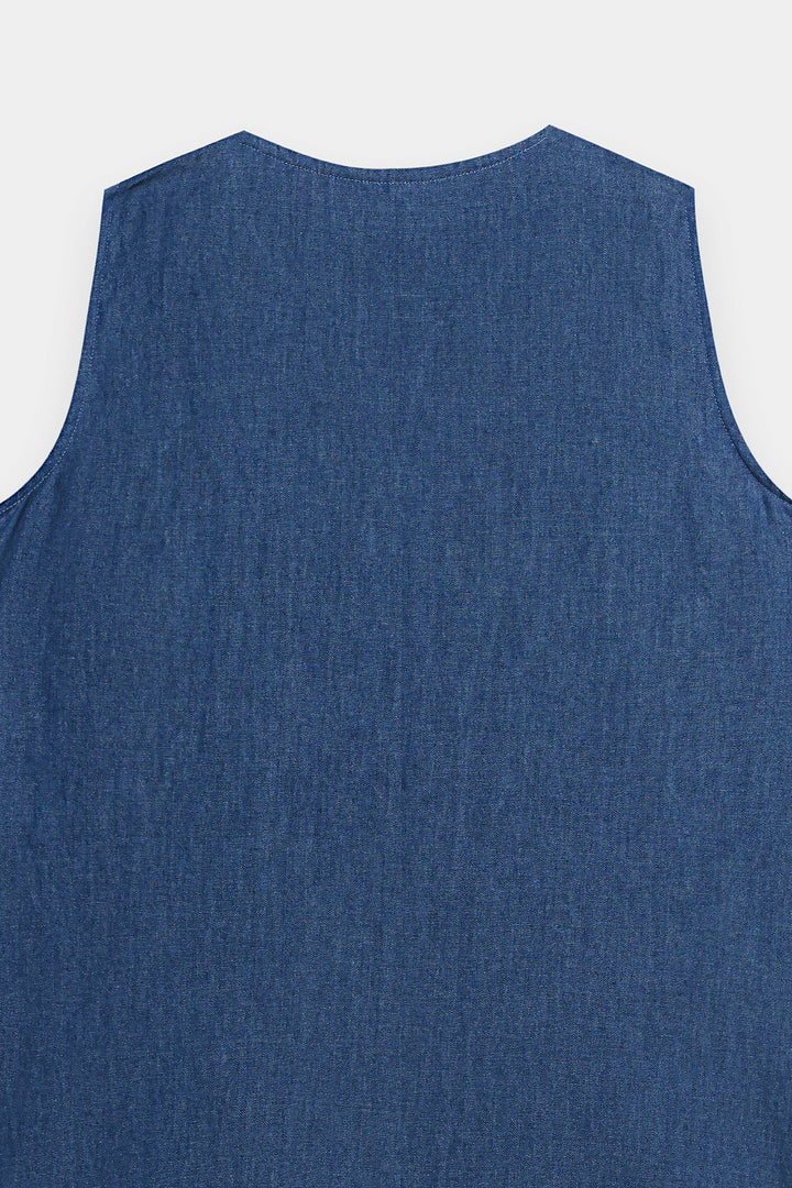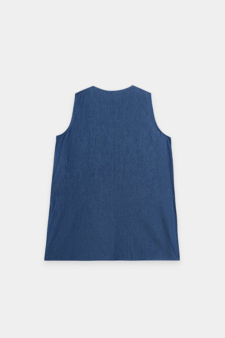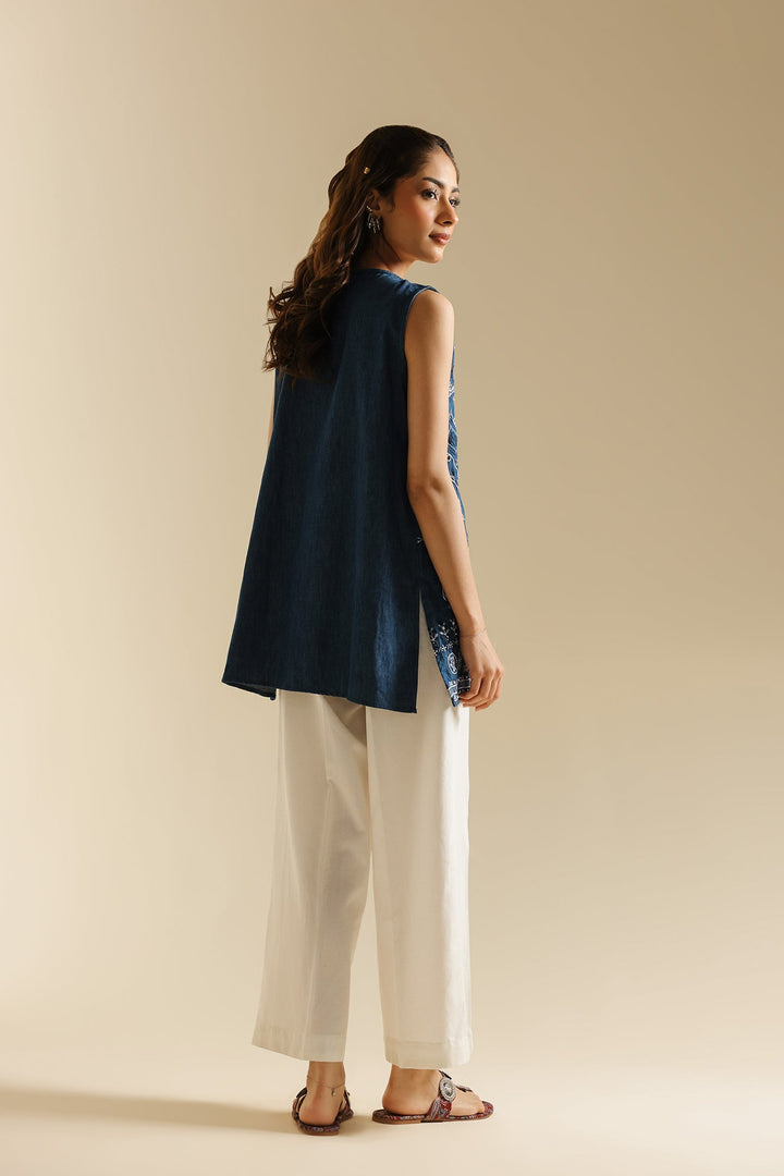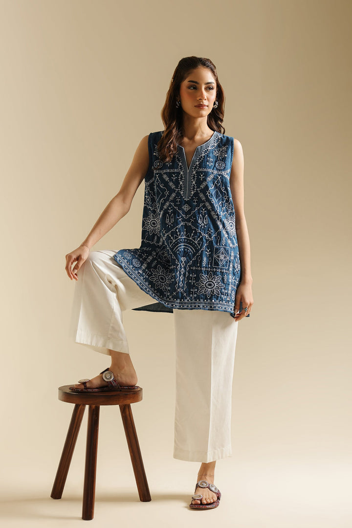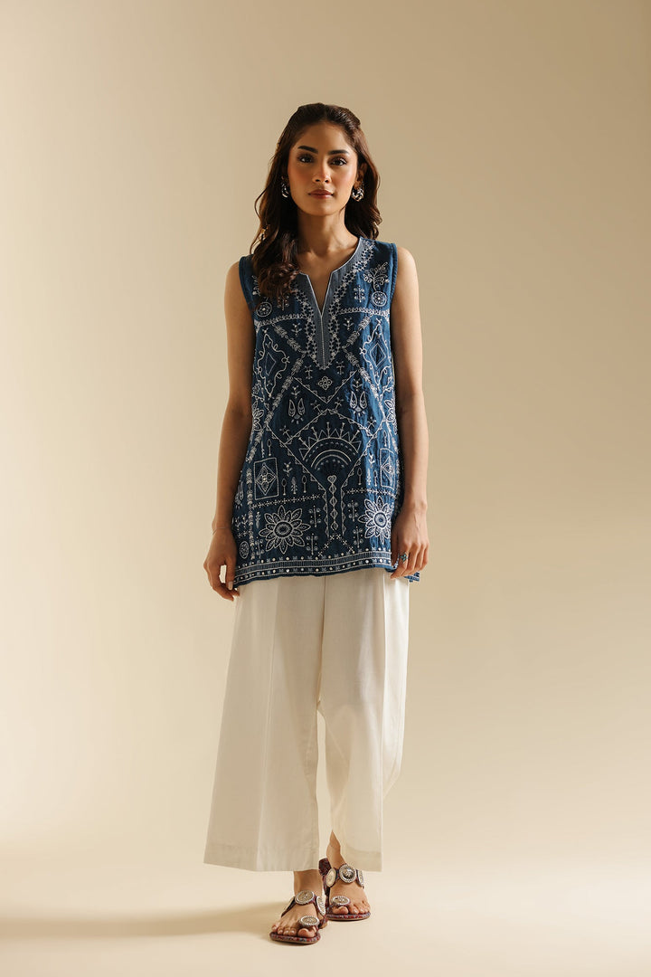 Feel chic and confident in this stunning blue embroidered sleeveless top. This unique piece features intricate white floral and geometric patterns, creating a beautiful contrast against the blue fabric. The relaxed fit and elegant design make it a versatile addition to your wardrobe, perfect for a day out or a special occasion.