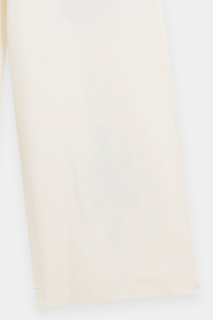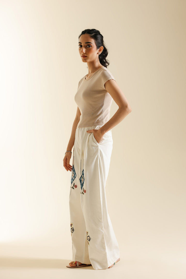Capture attention with these unique white embroidered trousers. These wide-leg trousers are crafted from a crisp white fabric, offering a comfortable and flowing silhouette. The highlight is the striking, vertically placed multi-colored embroidery on both legs, featuring detailed diamond and floral motifs in shades of blue, red, and yellow. These decorative trousers are perfect for pairing with a simple, solid-colored top to create a stylish, statement-making outfit.