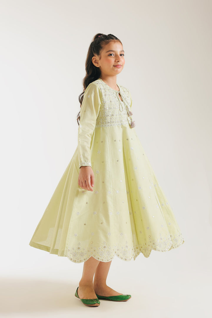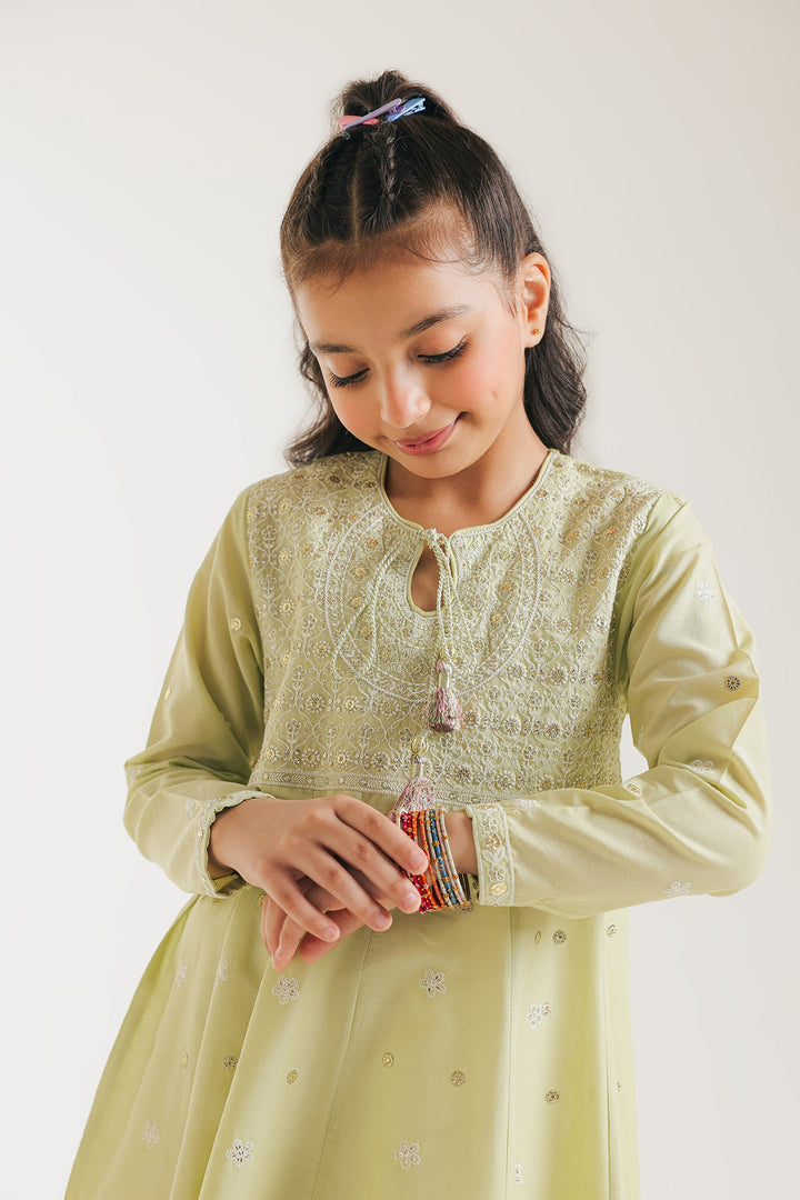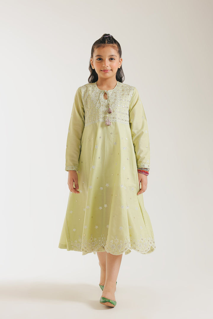 Presenting the latest statement outfit, the gracefully embroidered pishwas. This elegant piece features a classy pishwas silhouette with panels below the yoke, adorned with dazzling embroidery of mesmerizing floral designs. Perfect for the festive season, this outfit is a must-have for your little girls.