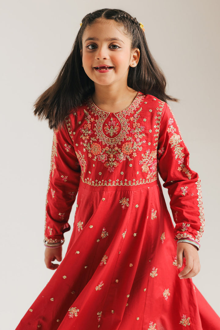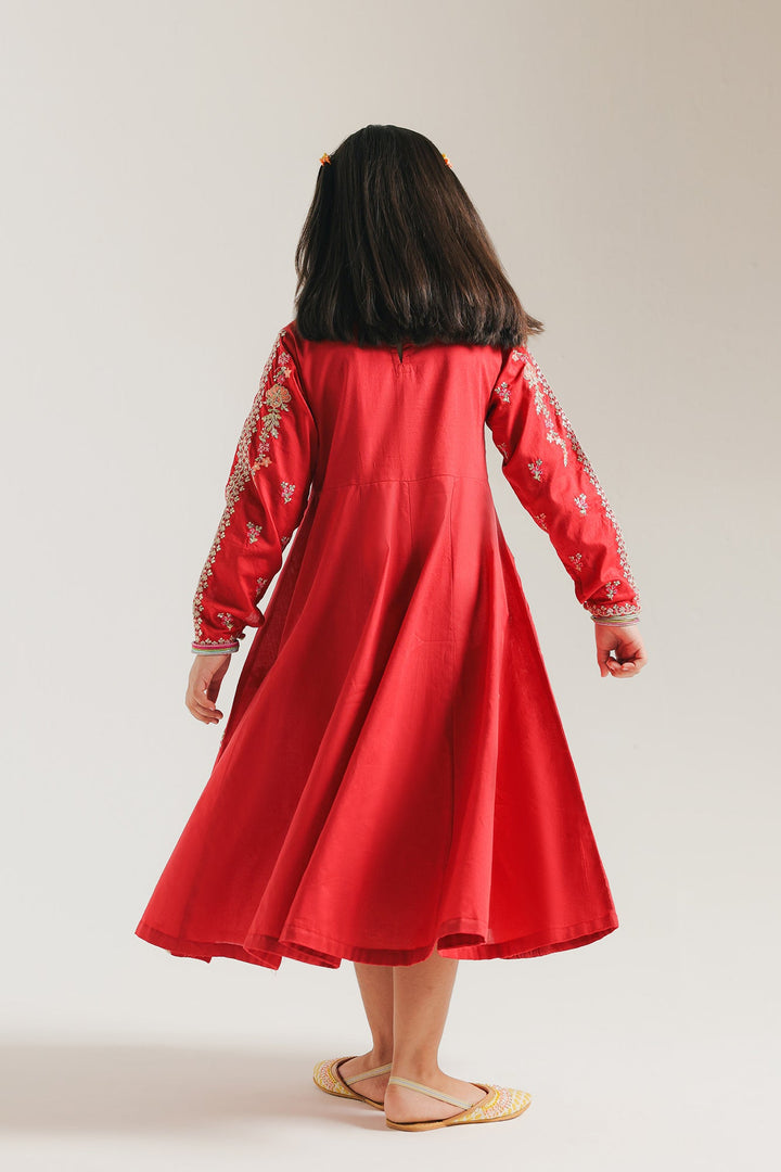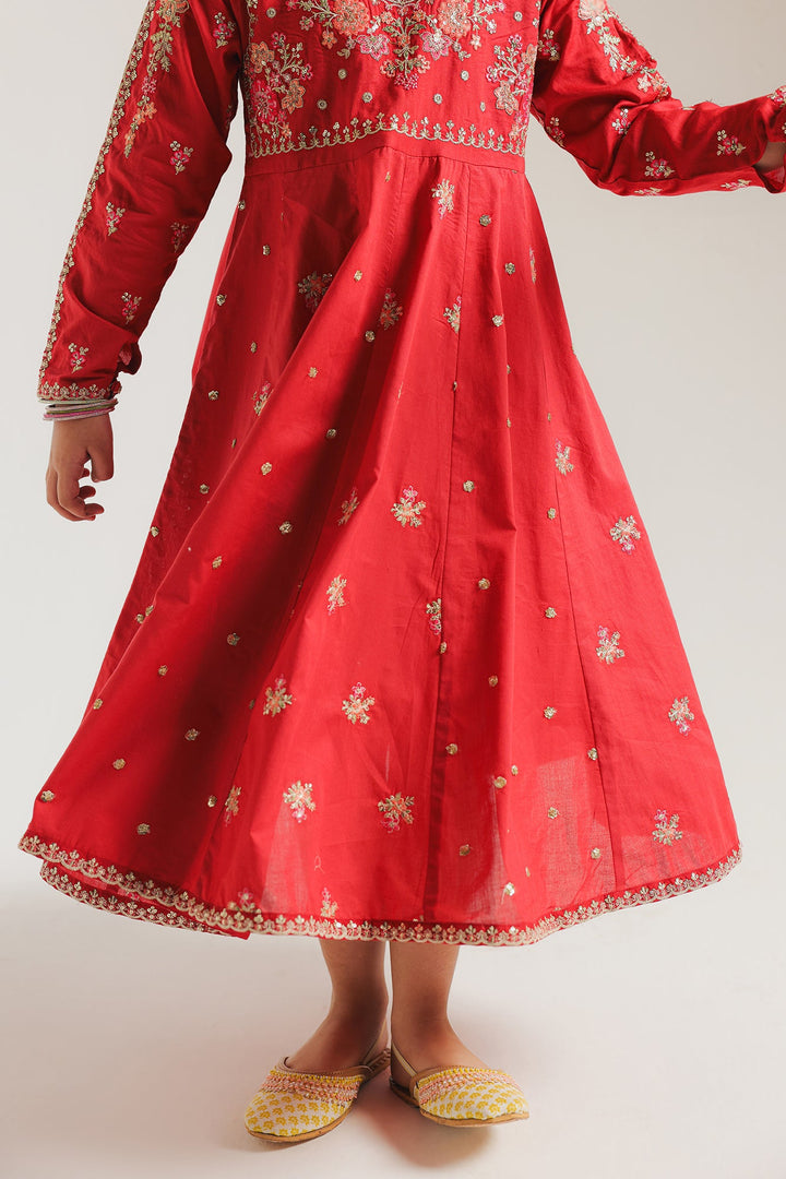 This stunning dress is a true celebration of vibrant color and exquisite detail. The dress, in a beautiful shade of festive red, has a flowing, flared silhouette that is perfect for twirling. The bodice and sleeves are lavishly adorned with intricate floral and vine embroidery in gold and silver threads, creating a shimmering and elegant effect. Delicate embroidered motifs are scattered across the skirt, adding to the luxurious feel. This enchanting dress is a perfect choice for a special occasion, offering a captivating and timeless look for a young girl.