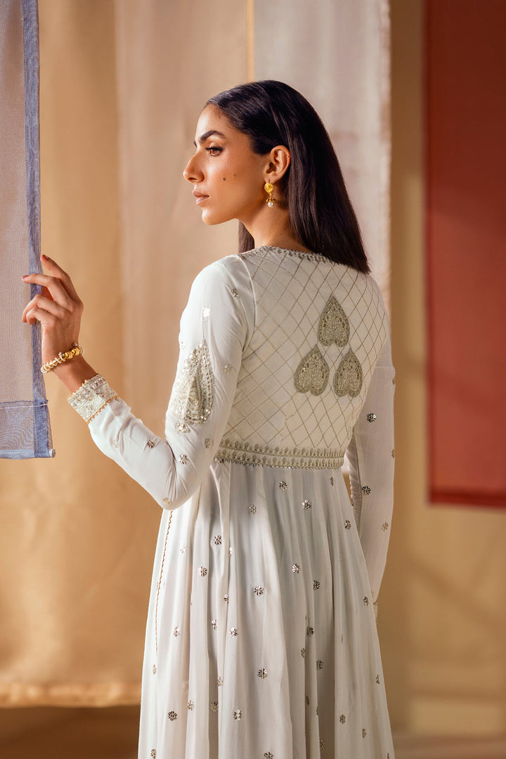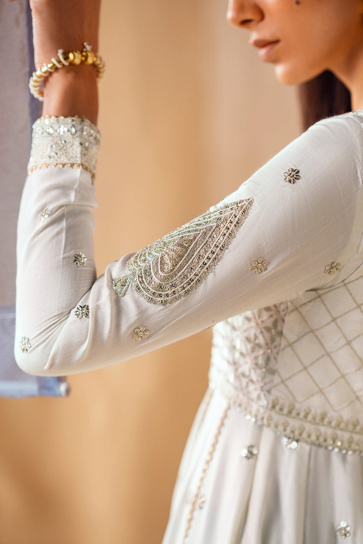 Unleash your inner goddess with this ethereal embroidered pishwas. The long, flowing pishwas in a crisp white fabric is adorned with delicate, shimmering details and intricate silver and gold embroidery on the bodice. It is complemented by a matching waistcoat with a striking, heavily embroidered pattern that adds a layer of sophistication. This ensemble is a timeless choice, perfect for a celebration.