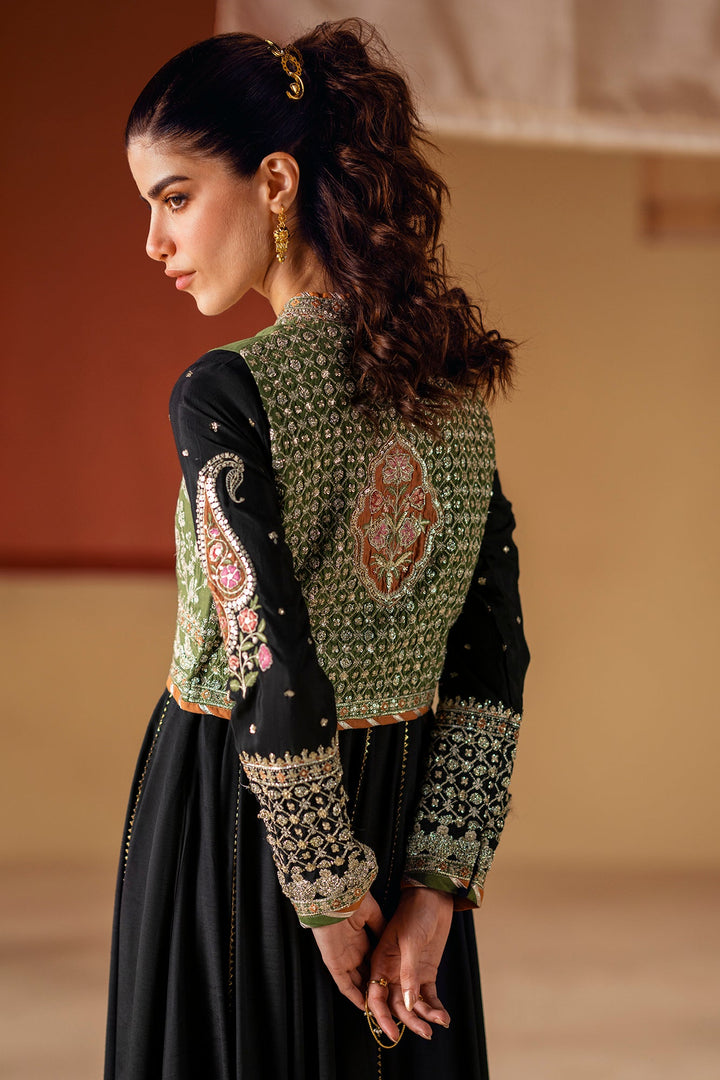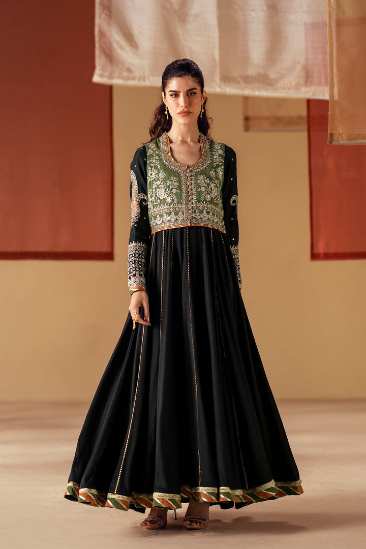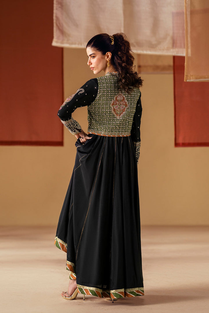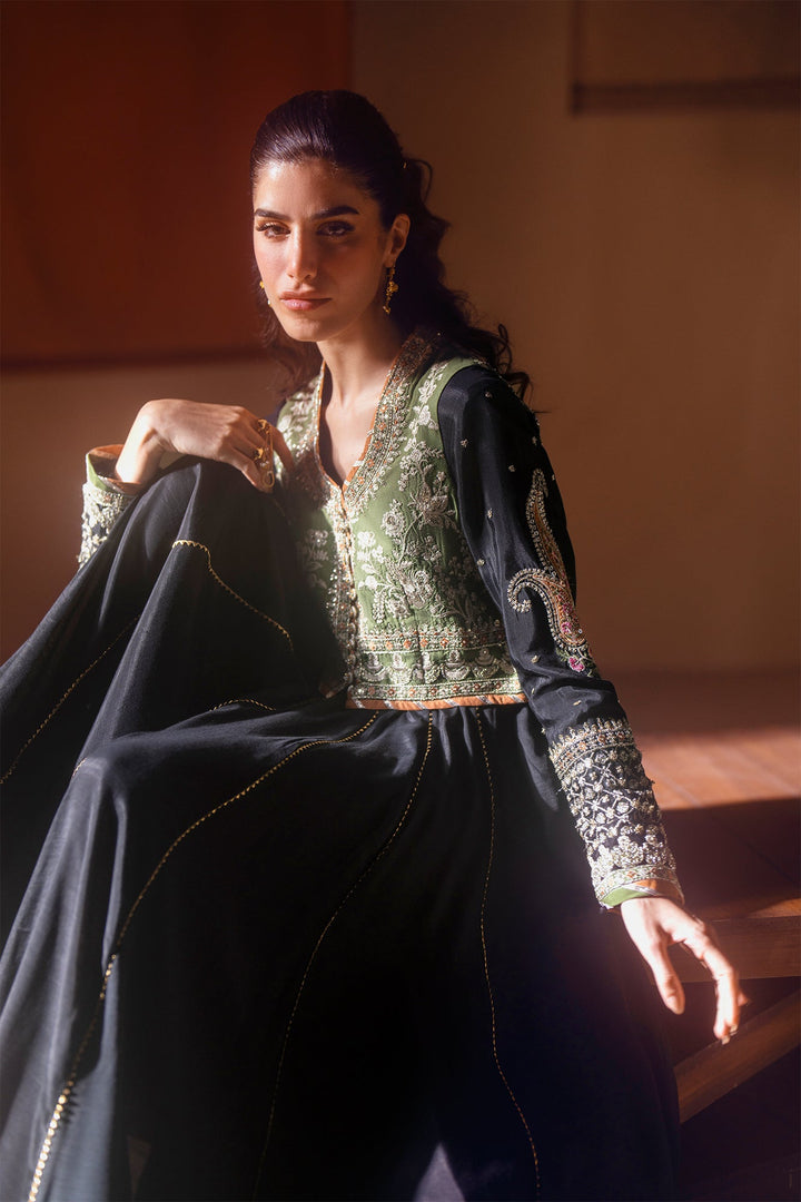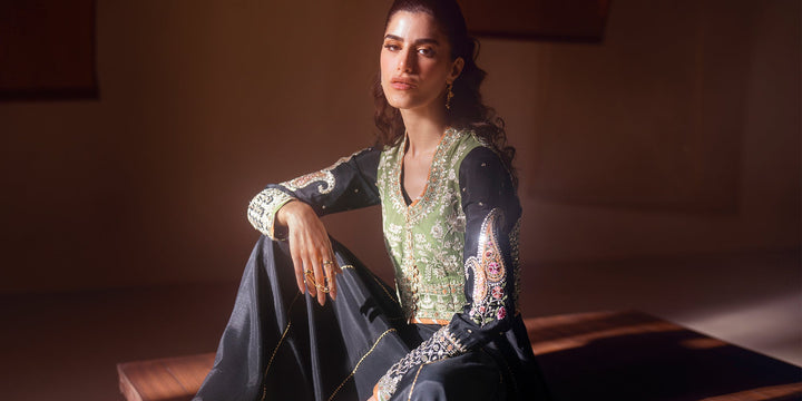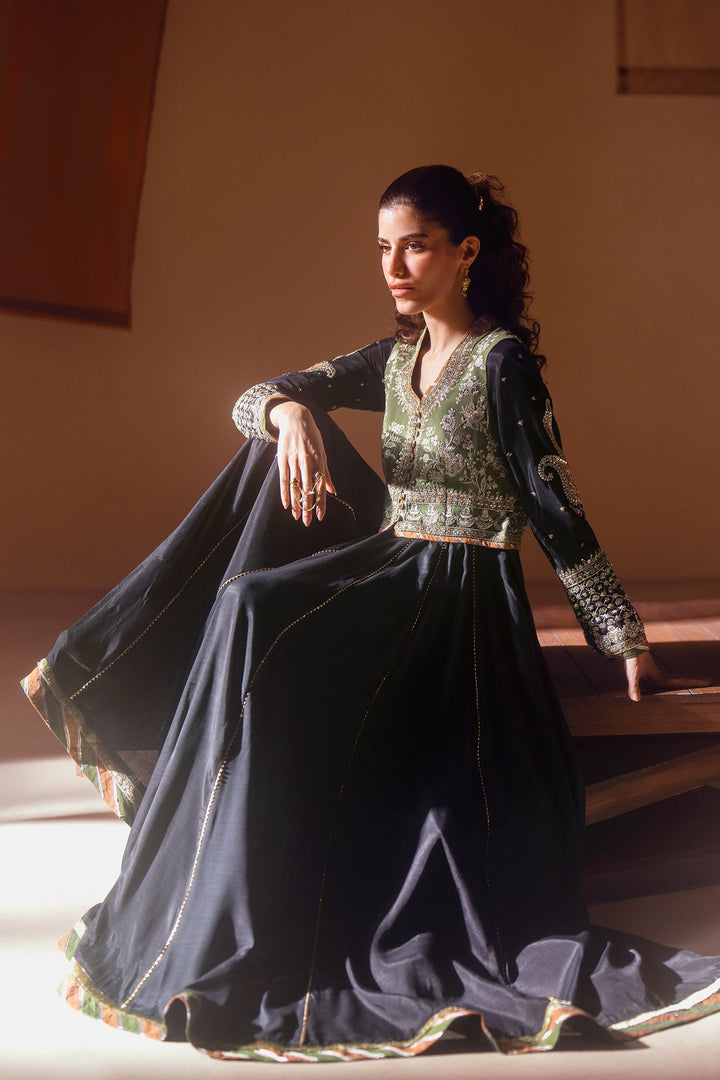 Unleash a bold and enchanting look with this pishwas and waistcoat set. The long, black pishwas flows with a graceful silhouette, while a contrasting embroidered waistcoat in a rich olive-green hue sits over the top. The waistcoat is adorned with intricate floral and ornamental embroidery creating a captivating focal point. This ensemble is a celebration of vibrant contrast and artistic craftsmanship, perfect for making a memorable statement.