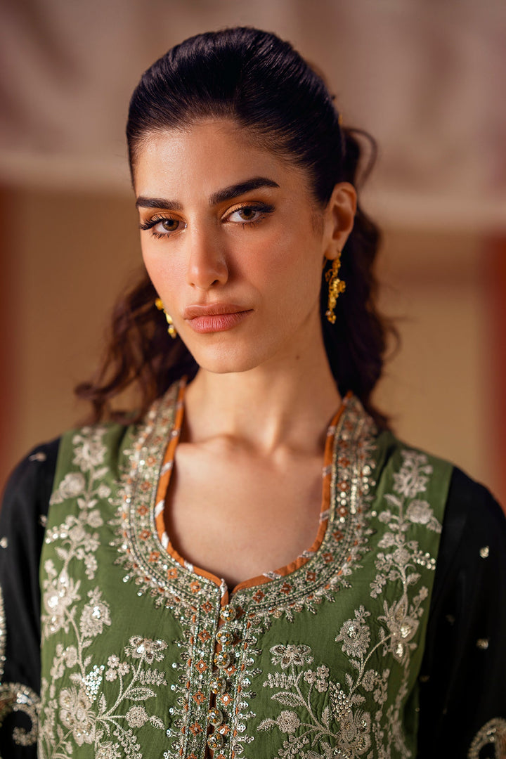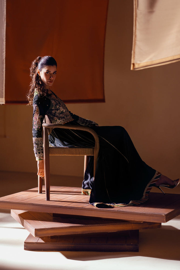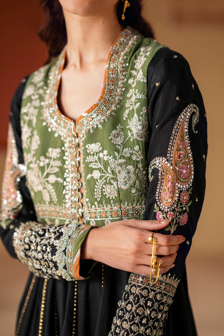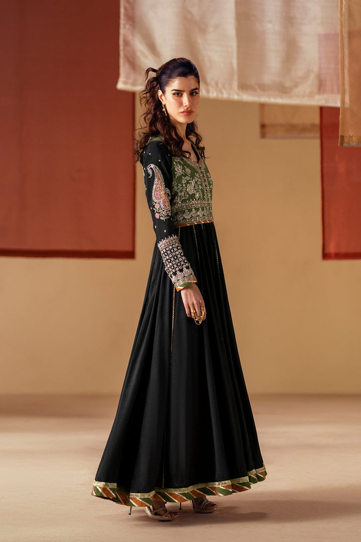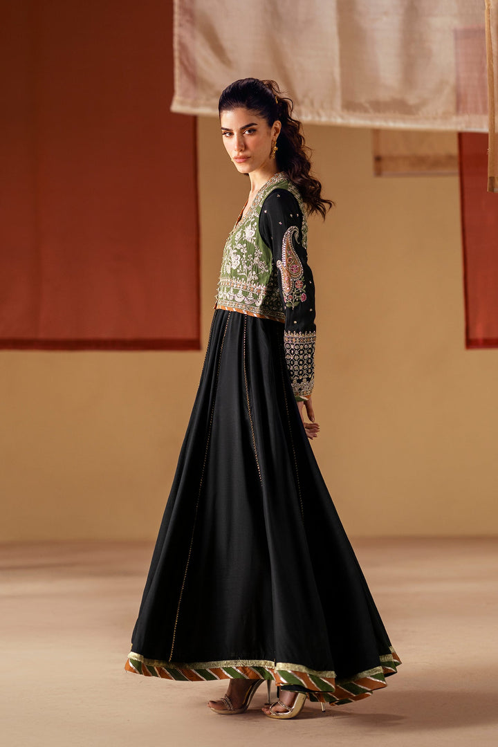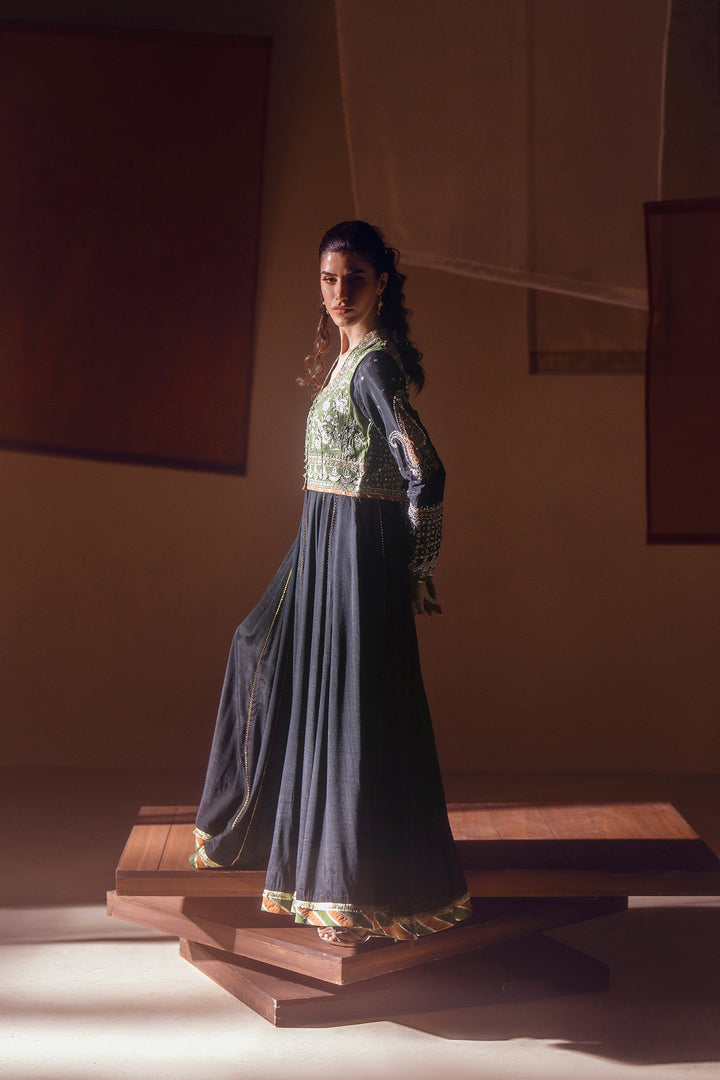 Unleash a bold and enchanting look with this pishwas and waistcoat set. The long, black pishwas flows with a graceful silhouette, while a contrasting embroidered waistcoat in a rich olive-green hue sits over the top. The waistcoat is adorned with intricate floral and ornamental embroidery creating a captivating focal point. This ensemble is a celebration of vibrant contrast and artistic craftsmanship, perfect for making a memorable statement.
