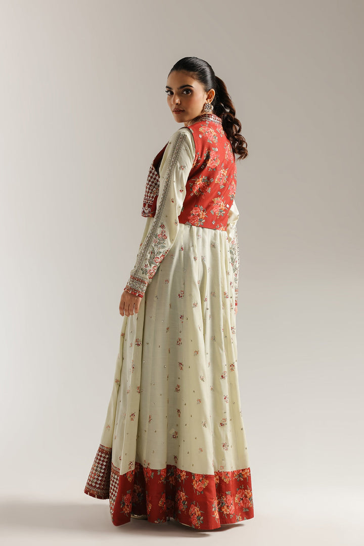 Make a regal statement with this enchanting pishwas and waistcoat set. The long, flowing pishwas in pale green fabric is beautifully adorned with delicate red floral embroidery. It is perfectly complemented by a separate, heavily embroidered waistcoat in a rich red and gold pattern that adds a layer of bold elegance. This ensemble is a celebration of vibrant color and captivating craftsmanship, perfect for a special event.
