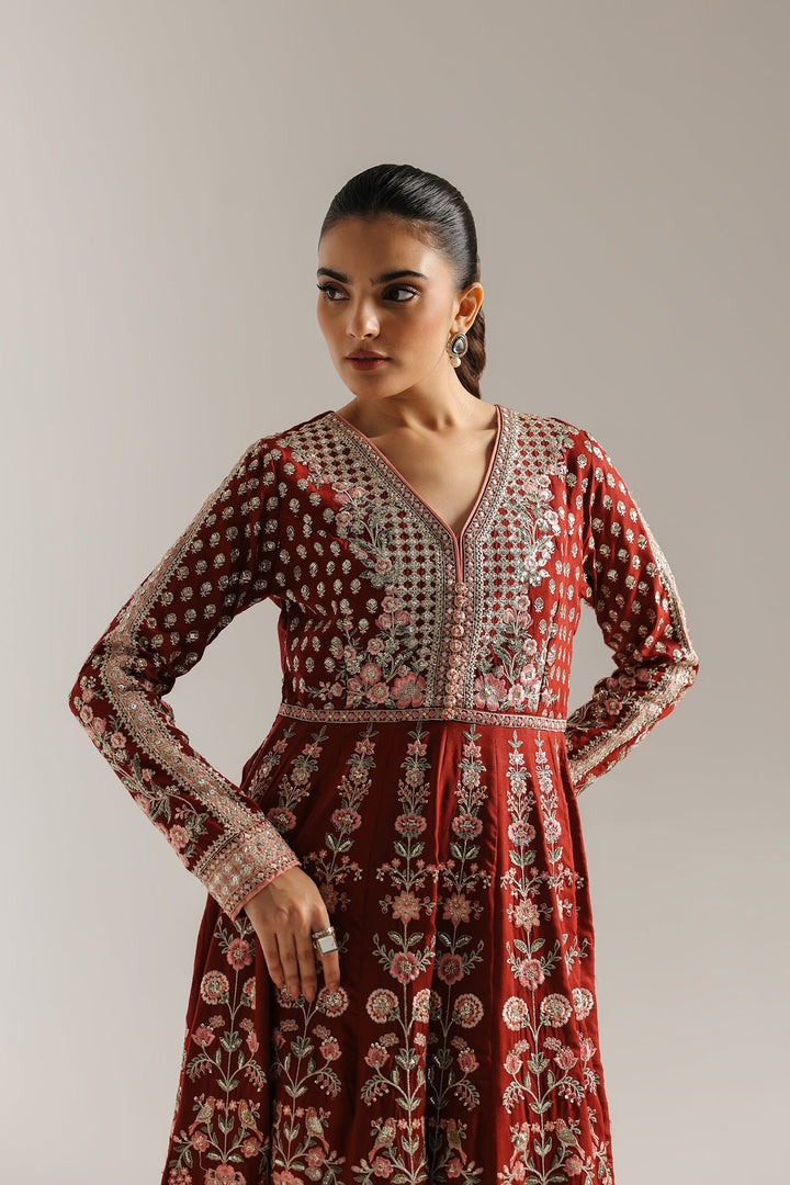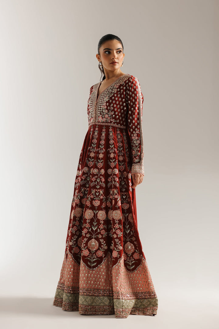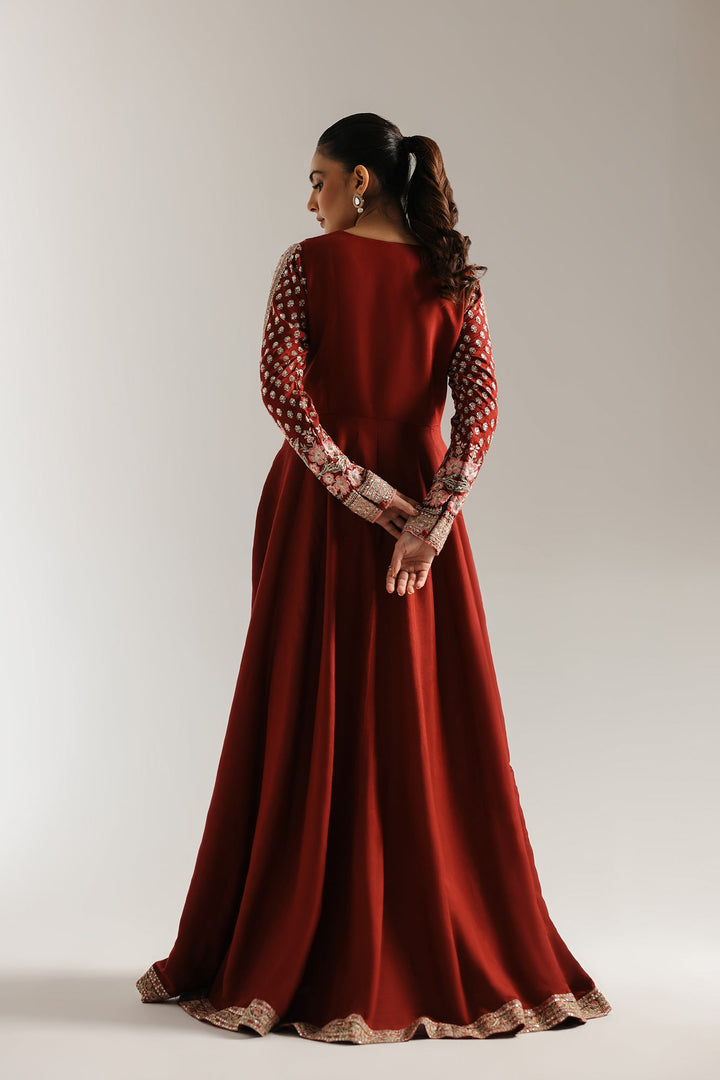 A vision of majestic elegance and artistry. This stunning embroidered dress features a deep, rich red fabric with a beautiful, flowing silhouette. The bodice is adorned with intricate silver and gold embroidery, while the voluminous skirt is embellished with delicate floral motifs. The look is completed with a bold, multi-layered embroidered border at the hem, creating a truly regal statement. This pishwas is a masterpiece of craftsmanship, perfect for a grand celebration.