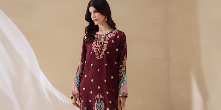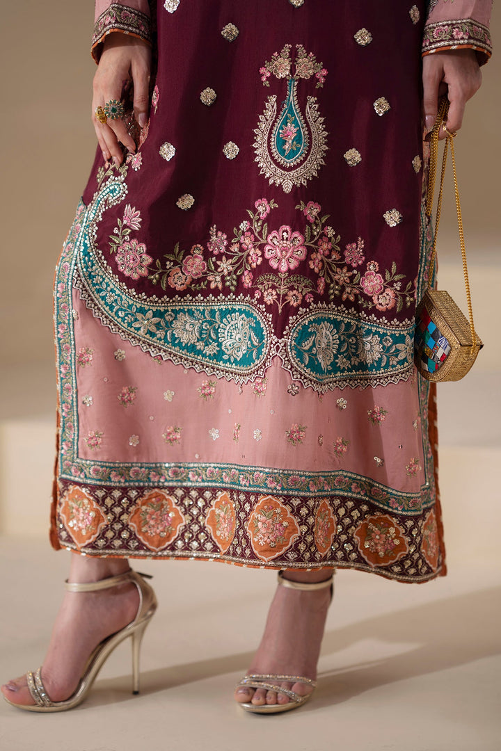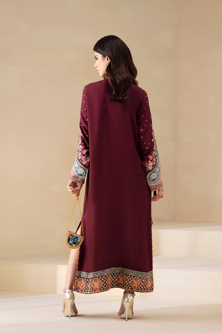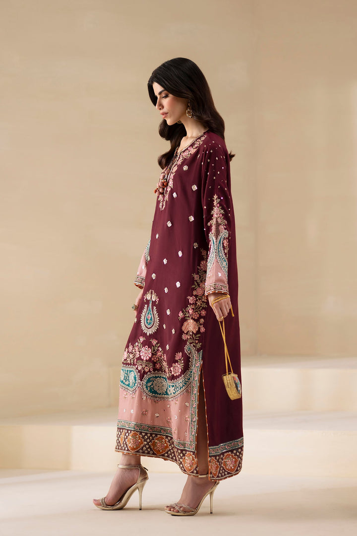 Channel regal richness in this stunning deep burgundy embroidered dress. This long, straight-cut dress is crafted from a deep burgundy fabric and is lavishly embellished with pink, gold, and turquoise thread embroidery. The design features large paisley and botanical motifs down the front, with scattered sequins adding a subtle sparkle. The hem and sleeves boast a striking border in soft pink and teal, transitioning seamlessly from the main color. Completed with an embellished neckline and delicate tassels, this elegant dress is a magnificent choice for any formal event or celebration.