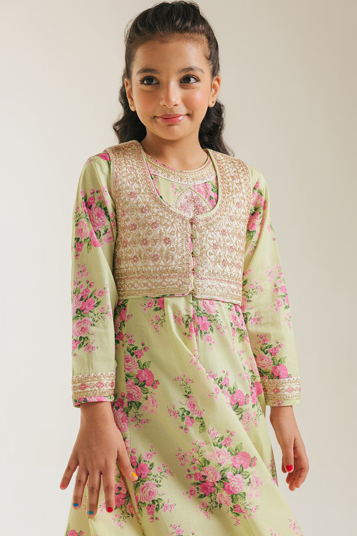 Elevate her festive wardrobe with this enchanting pale Green floral pishwas set with embroidered jacket, a delightful ensemble designed for timeless charm. The graceful pishwas features a soft lime green base adorned with an all-over print of blooming pink roses, creating a fresh and vibrant look. This beautiful frock is elegantly complemented by a charming sleeveless jacket, exquisitely detailed with intricate gold and silver embroidery that adds a touch of traditional opulence. Perfect for family celebrations, weddings, or any special occasion, this two-piece set ensures she looks absolutely radiant while enjoying ultimate comfort.