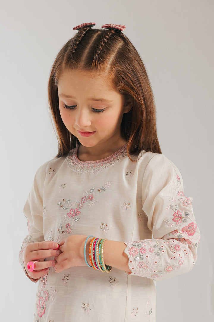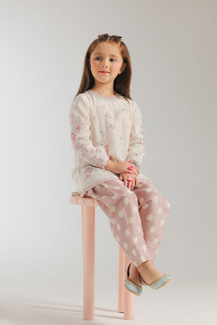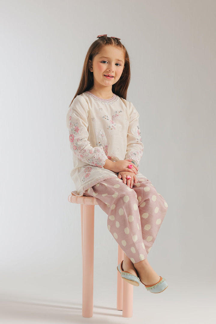 A contemporary composition crafted in a trendy silhouette shirt beautifully adorned with captivating floral designs embroidered in vibrant colors and enhanced with schiffli technique. Paired with a trendy shalwar adorned with polka dot prints, this style statement outfit is a perfect option for your girls to embrace at festive occasions.