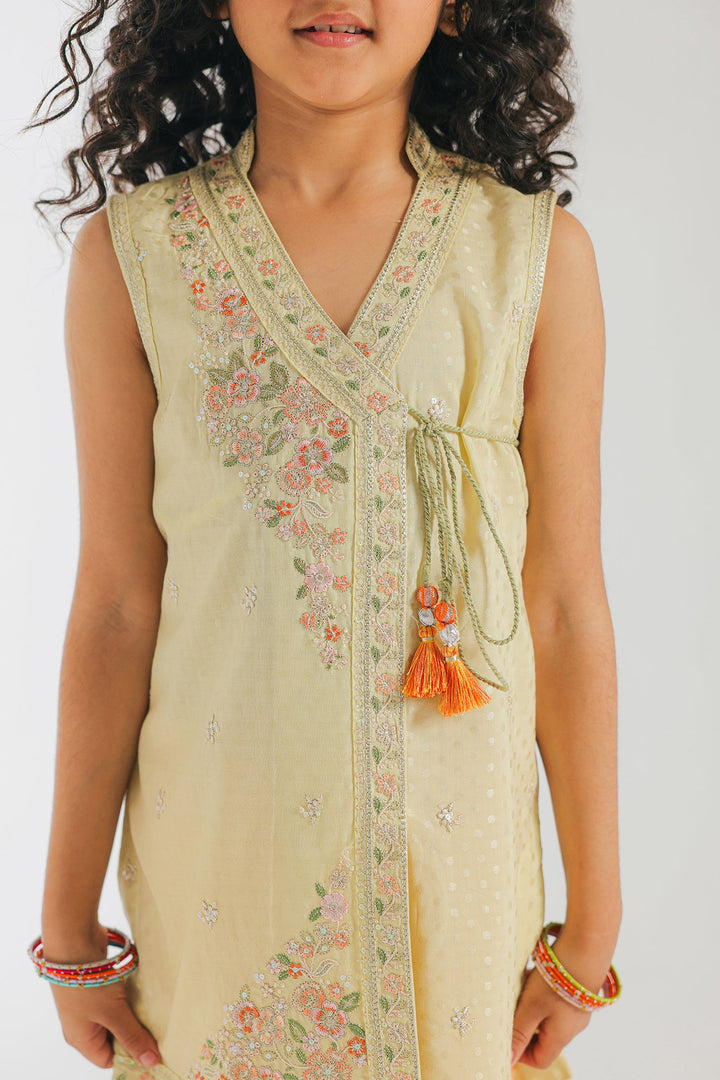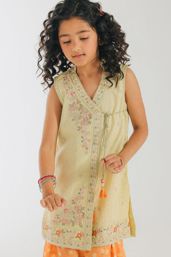 A contemporary composition crafted in a trendy sleeveless silhouette shirt beautifully adorned with captivating floral designs embroidered in vibrant colors and enhanced with scintillating embellishments. Paired with a contrasted vibrant printed shalwar, this style statement outfit is a perfect option for your girls to embrace at festive occasions.