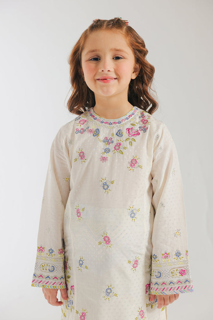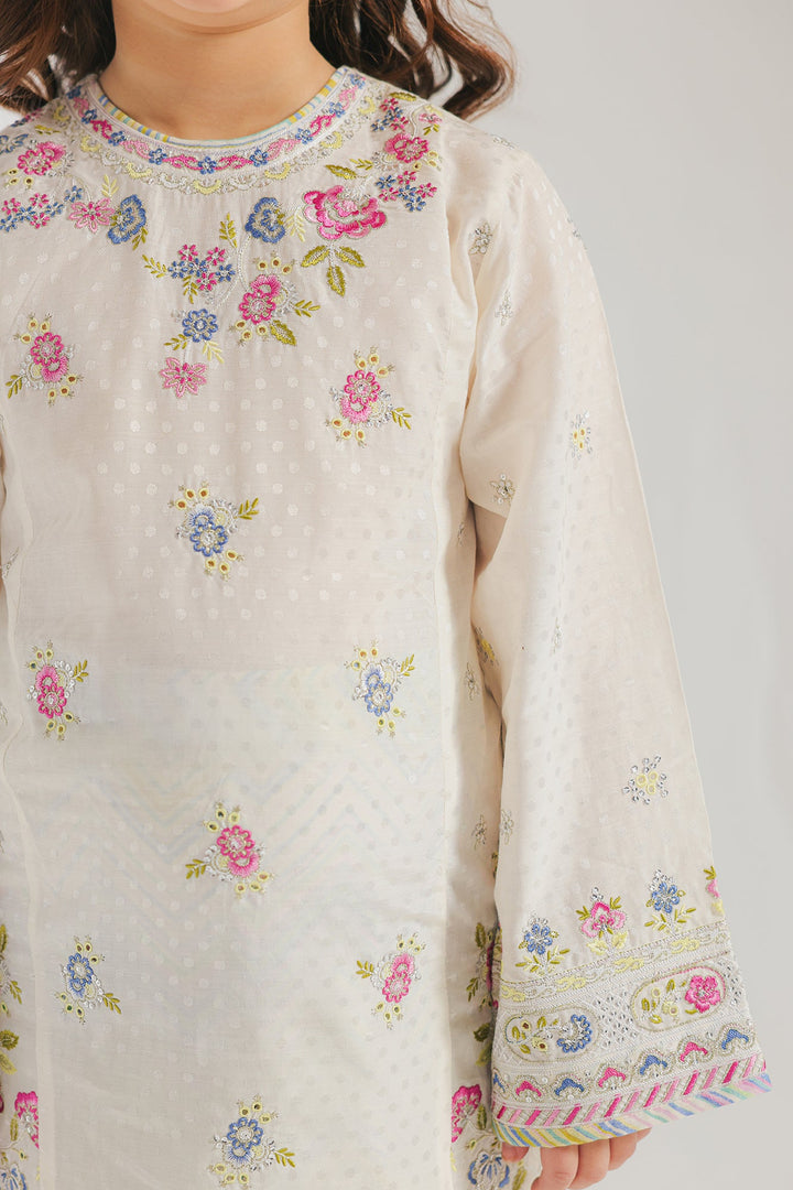 A contemporary composition crafted in a trendy silhouette shirt beautifully adorned with captivating floral designs embroidered in vibrant colors and enhanced with scintillating details. Paired with a trendy trouser adorned with chevron prints and enriched with delicate embroidery at bottom opening, this style statement outfit is a perfect option for your girls to embrace at festive occasions.