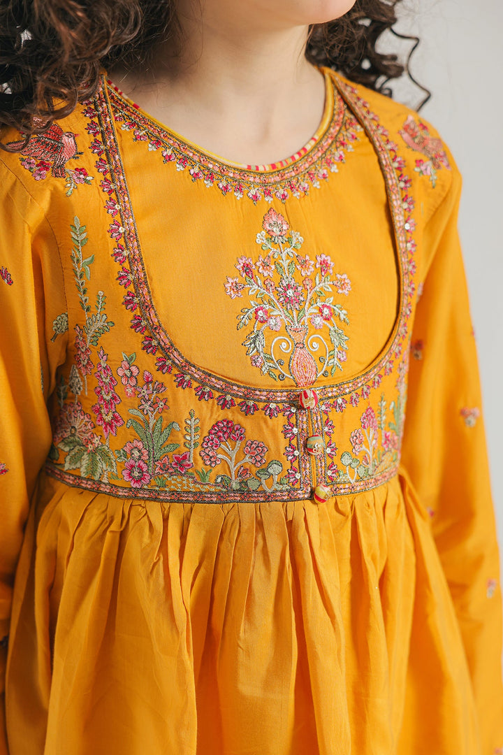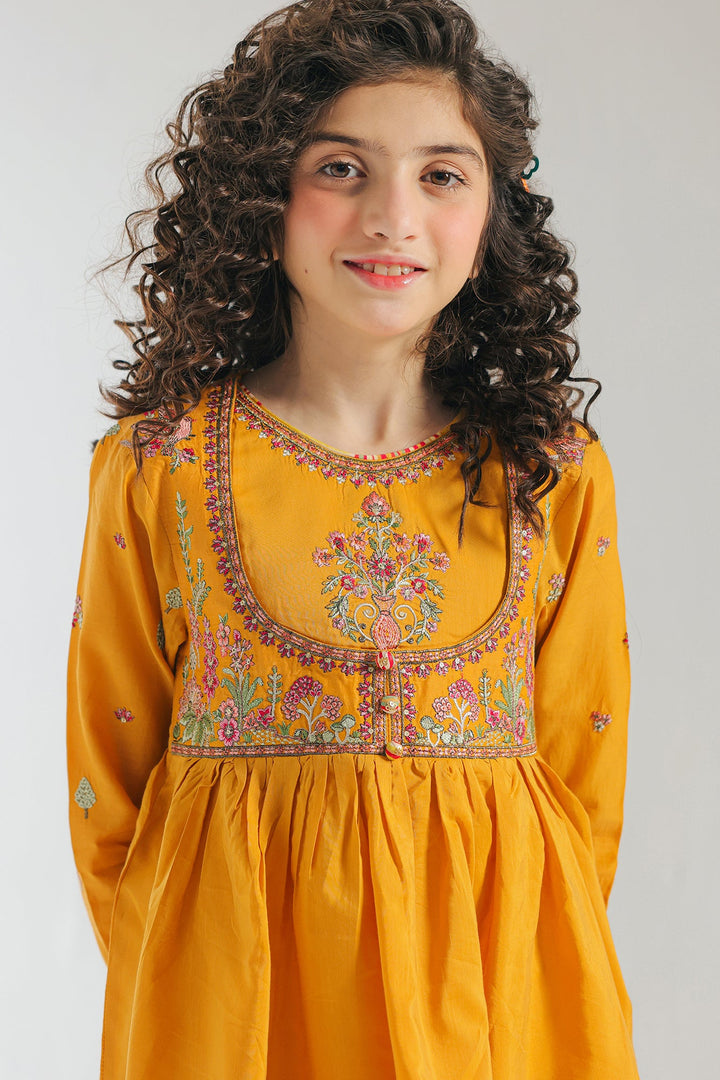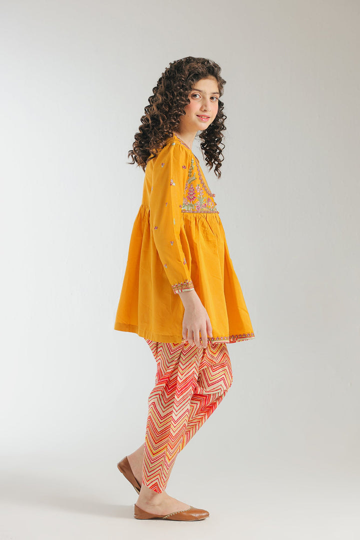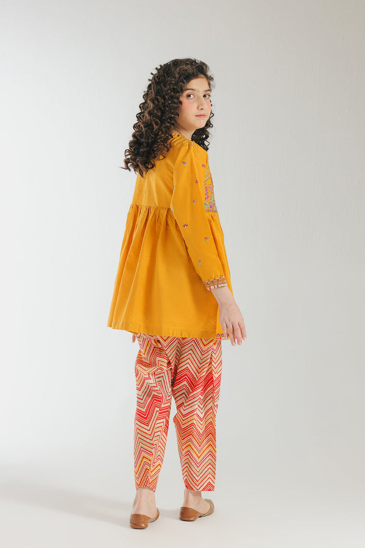 A contemporary composition crafted in a trendy frock silhouette shirt illustrating a traditional design and beautifully adorned with captivating floral designs embroidered in vibrant colors and enhanced with scintillating details. Paired with a trendy shalwar adorned with chevron stripe prints, this style statement outfit is a perfect option for your girls to embrace at festive occasions.