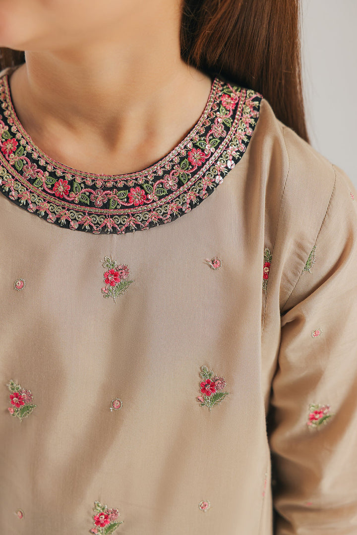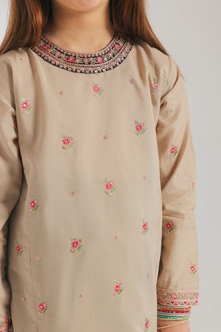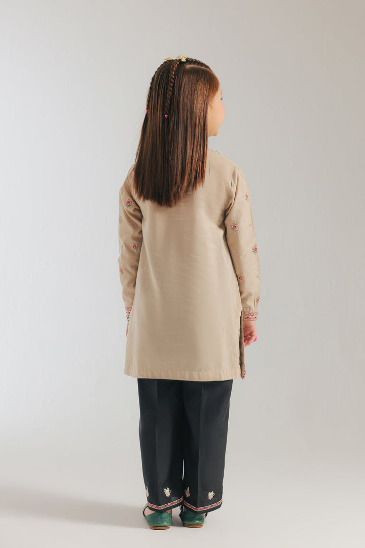 A contemporary composition crafted in a trendy silhouette shirt beautifully adorned with captivating floral designs embroidered in vibrant colors and enhanced with scintillating designs. Paired with a contrasted black gracefully embroidered culotte trouser, this style statement outfit is a perfect option for your girls to embrace at festive occasions.