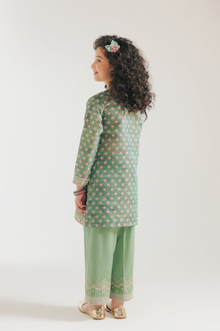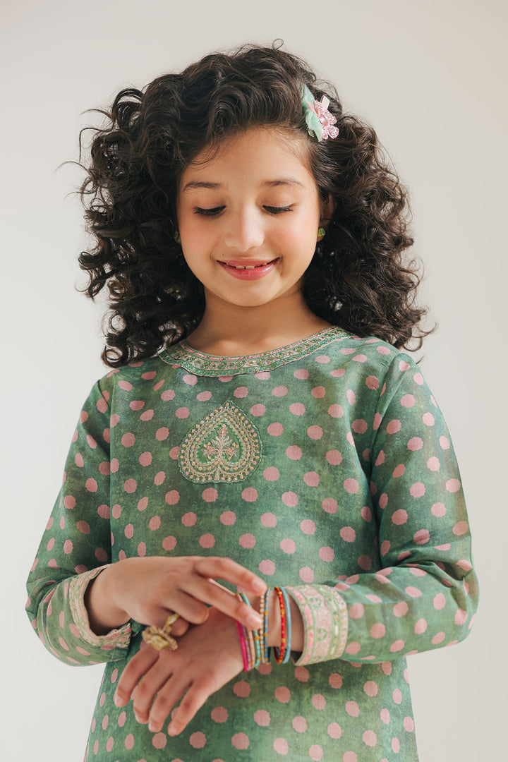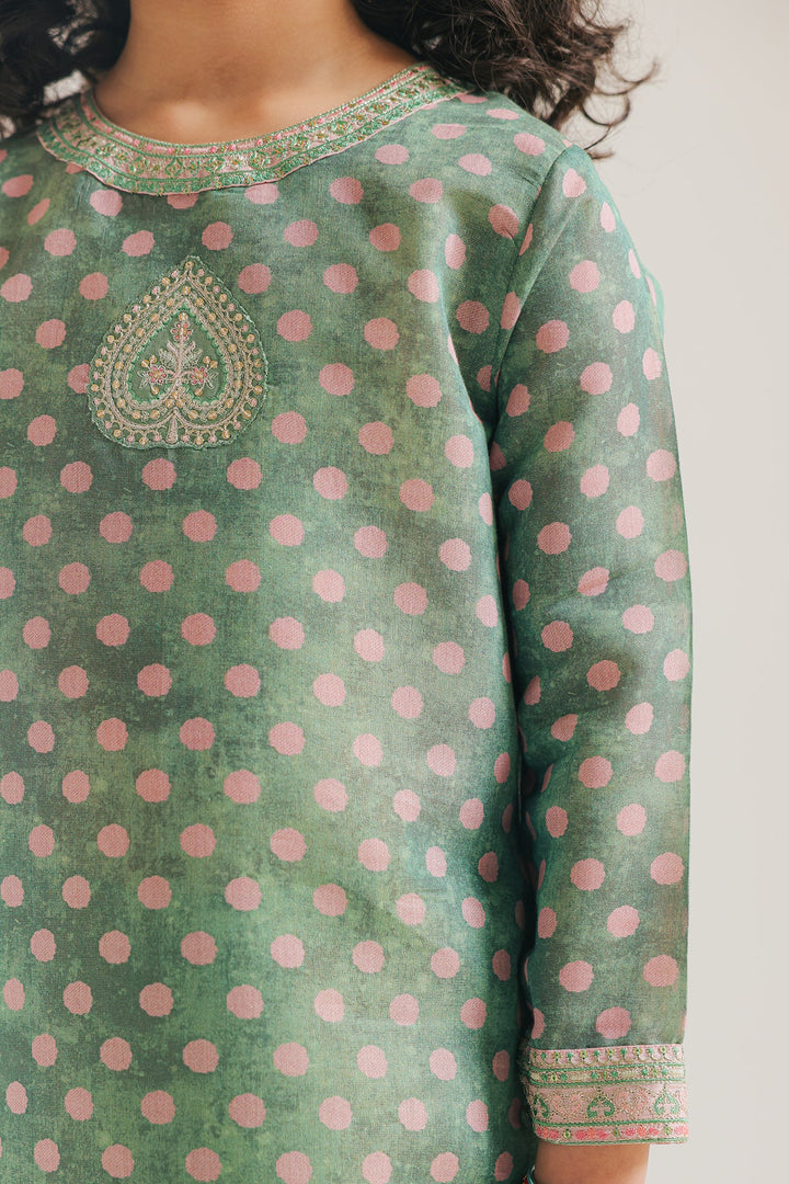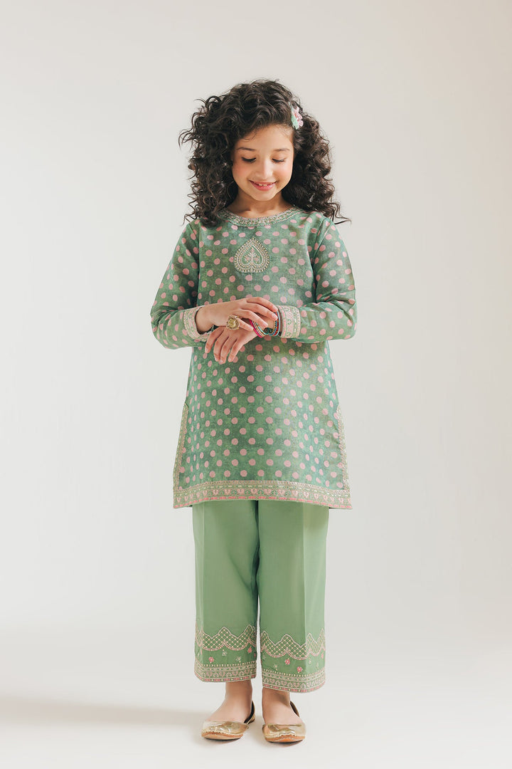 A contemporary composition crafted in a trendy silhouette shirt illustrating polka dot prints and beautifully adorned with captivating floral designs embroidered in vibrant colors and enhanced with scintillating details. Paired with a trendy culotte trouser adorned with intricate embroidery, this style statement outfit is a perfect option for your girls to embrace at festive occasions.