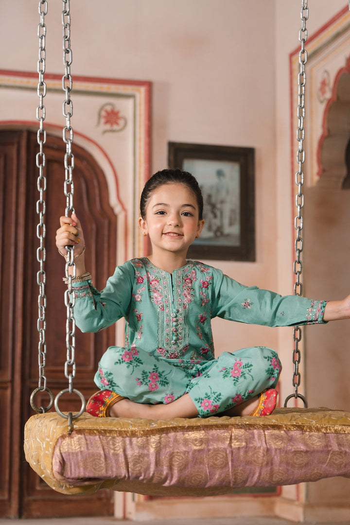 A contemporary composition crafted in a trendy silhouette shirt beautifully adorned with captivating floral designs embroidered in vibrant colors and enhanced with scintillating designs. Paired with a trendy shalwar adorned with gorgeous floral prints, this style statement outfit is a perfect option for your girls to embrace at festive occasions.