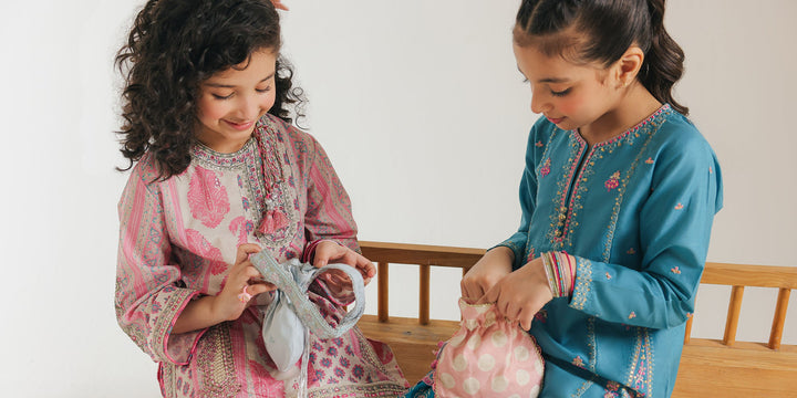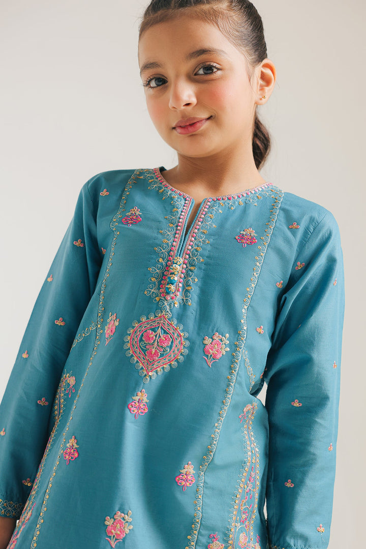 A contemporary composition crafted in a trendy silhouette shirt illustrating a traditional design and beautifully adorned with captivating floral designs embroidered in vibrant colors and enhanced with scintillating details. Paired with a trendy shalwar adorned with paisley prints, this style statement outfit is a perfect option for your girls to embrace at festive occasions.