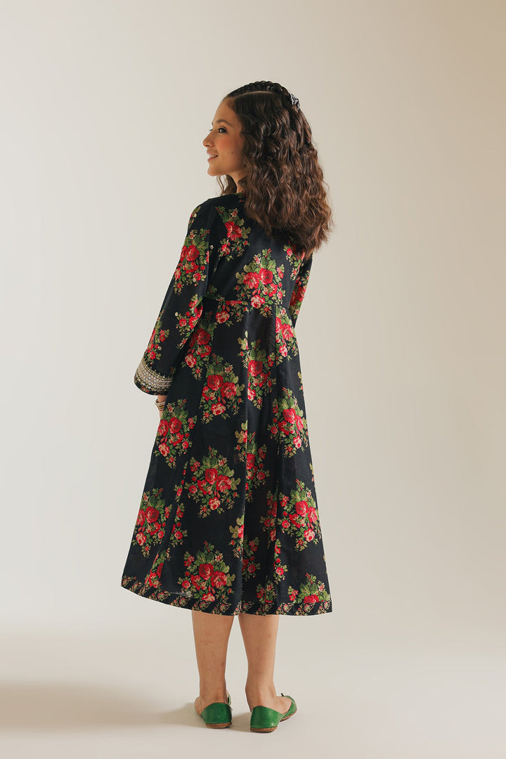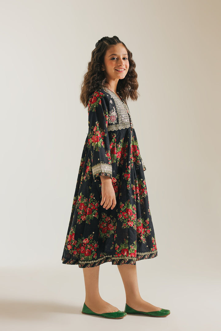 Step into a world of timeless charm with our "Midnight Bloom" Pishwas, a captivating addition to any young girl's wardrobe. This exquisite black pishwas features a mesmerizing all-over floral print in rich reds and greens, reminiscent of a secret garden at dusk. The flowing, full-length silhouette offers an elegant drape, perfect for twirling and special occasions. The true highlight lies in the meticulously embroidered bodice, adorned with intricate patterns in shimmering gold, silver, and soft pink threads. With its comfortable fit and graceful design, this pishwas is ideal for festive celebrations, formal events, or any moment where a touch of classic beauty is desired. Let your little one bloom in this enchanting piece that beautifully blends heritage with contemporary style.