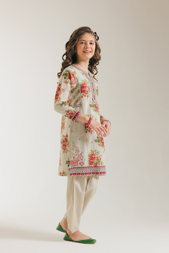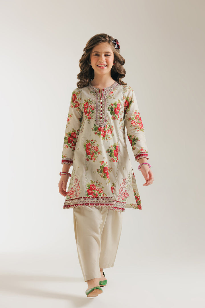 Twirl into festivities with this classy ensemble that's bursting with personality! This trendy shirt showcases eye-catching traditional prints and vibrant floral embroidery that'll make your little fashionista the star of any celebration. The solid shalwar, completes this fun outfit. Perfect for your girl to dance, play, and make merry memories during special occasions while looking absolutely fabulous!