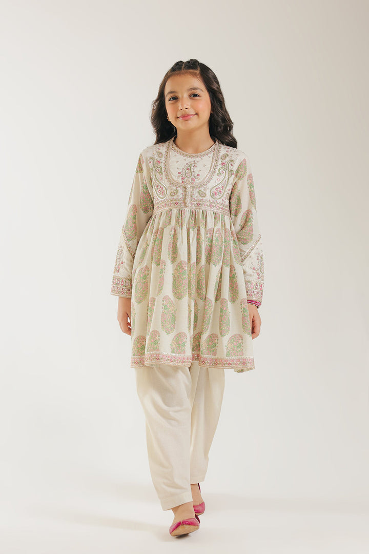 This modern ensemble features a stylish dress design with a classic touch, highlighted by intricately embroidered floral patterns in scintillating colors and scintillating details layered on a classy off white canvas printed canvas. The solid shalwar adds a trendy element with its elegant silhouette, making it the ideal outfit for your girls to dazzle in at any festive event.