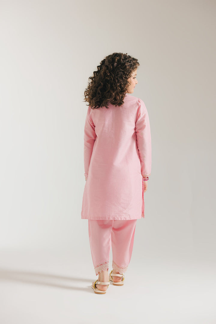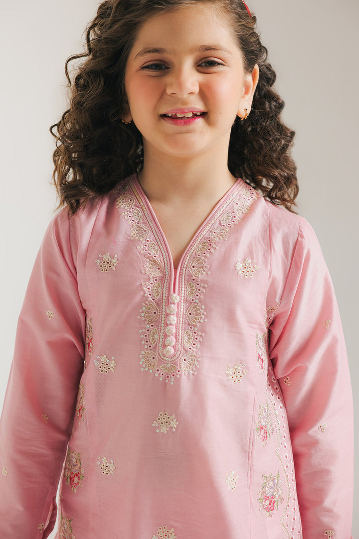 Discover a fusion of traditional and modern in this graceful outfit. Vibrant floral embroidery with schiffli technique pops with sparkling embellishments on this chic shirt and complimented with an elegant embroidered shalwar. Perfect for girls' celebrations, embrace the exquisite craftsmanship and eye-catching colors.