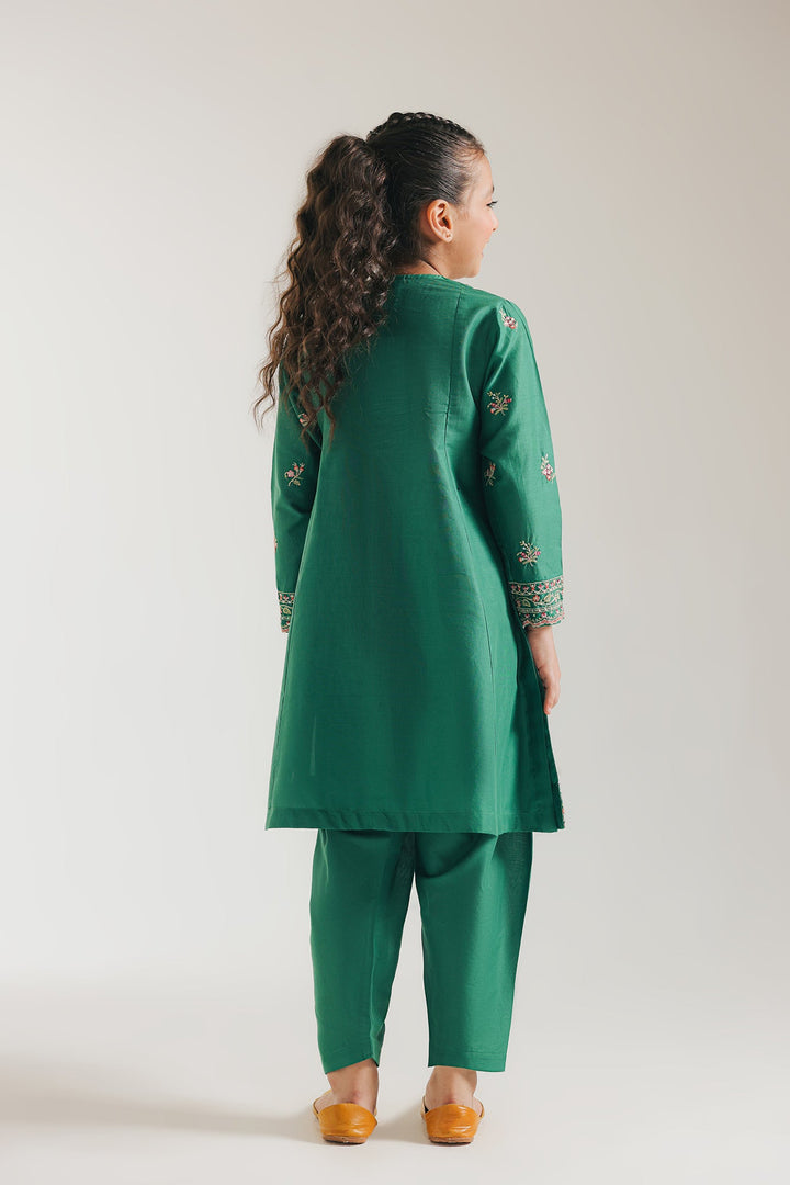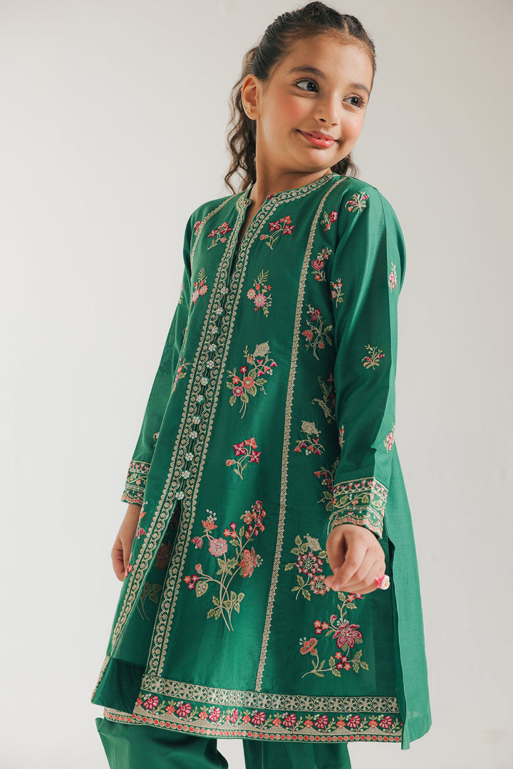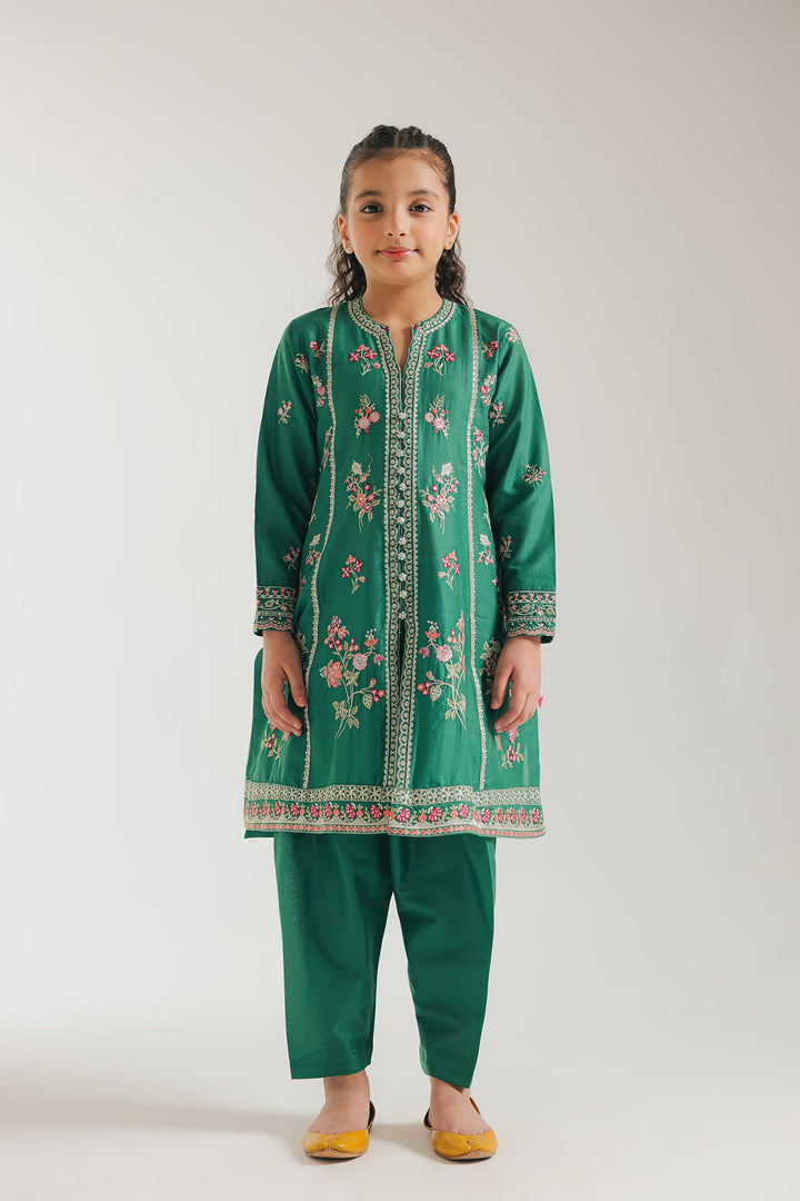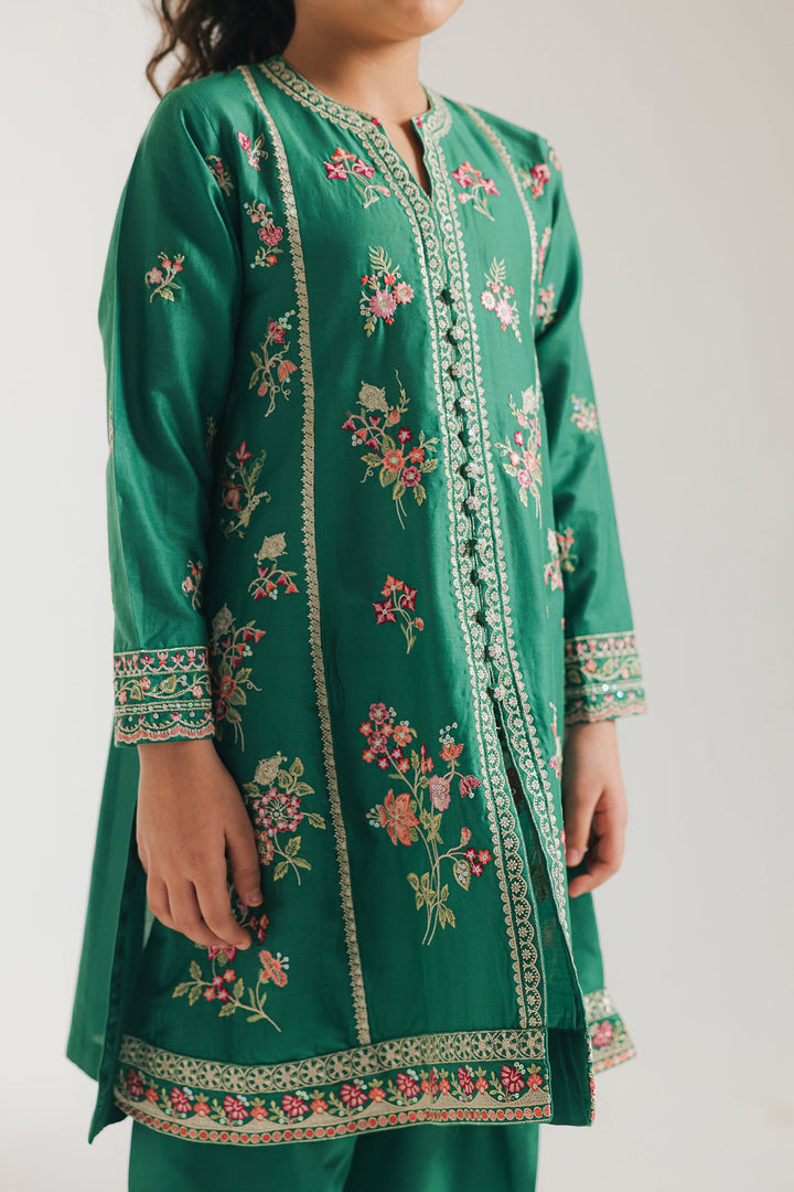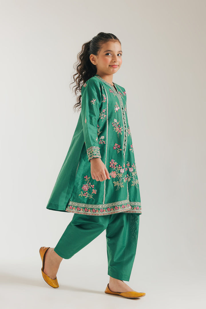 An up-to-date outfit featuring a stylish silhouette Aline shirt with a slit at front bottom and a classic design with stunning floral embroidery in vivid colors and intricate details. Paired with a fashionable solid shalwar, this statement piece is ideal for your girls to wear at festive gatherings.