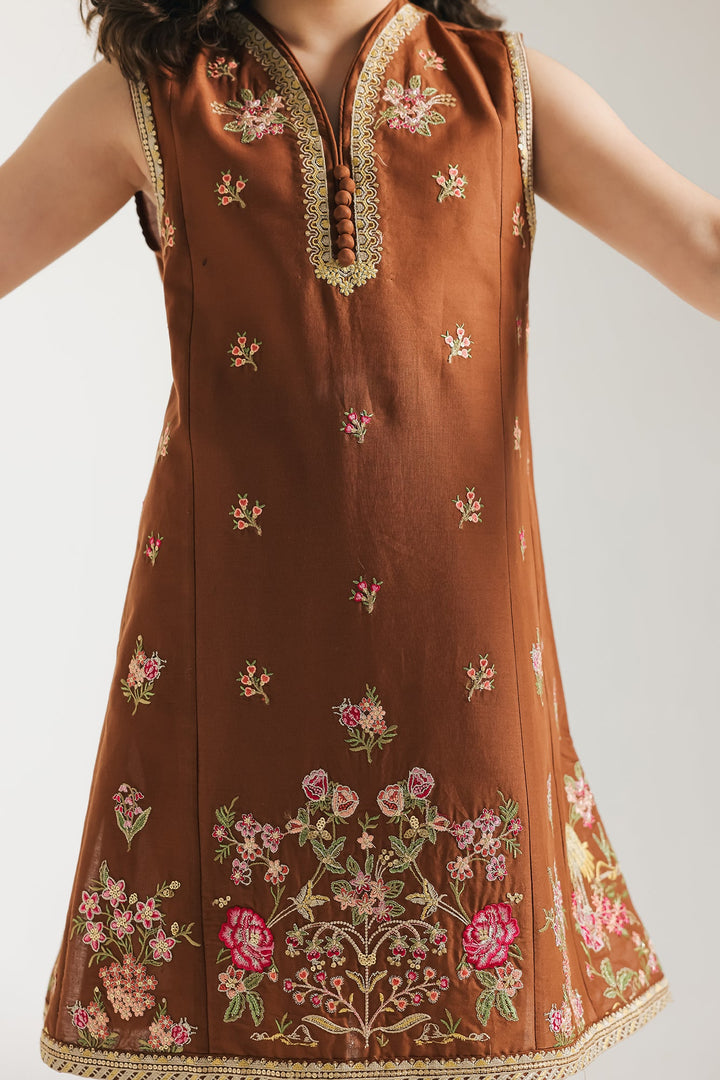 A modern yet graceful sleeveless shirt featuring a traditional design, elegantly embellished with vibrant floral embroidery and dazzling accents layered on a mesmerizing brown canvas. Paired with a contemporary solid trouser, this statement outfit is the perfect choice for your girls to wear on festive occasions.