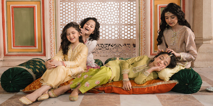 A modern yet graceful shirt featuring a traditional design, elegantly embellished with vibrant floral embroidery and dazzling accents layered on a mesmerizing yellow canvas. Paired with a contemporary trouser adorned with delicate embroidery at scalloped bottom opening, this statement outfit is the perfect choice for your girls to wear on festive occasions.