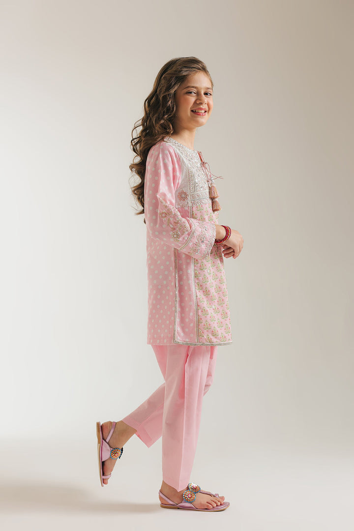 Dive into cuteness with this light pink graceful suit! Adorned with playful stitches on the neck, front border, and sleeves, layered on a beautiful printed canvas, this charming outfit pairs perfectly with a solid shalwar. Watch your little princess twirl with joy in this special ensemble – it's like a magical outfit-up party for every celebration! Let her sparkle and giggle in style.