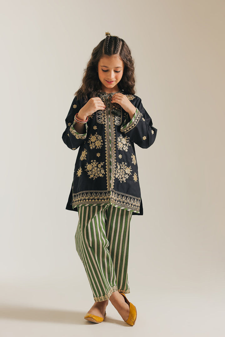 Unveil a world of timeless elegance with our enchanting ensemble, designed to make your little one shine. This exquisite outfit features a rich black kurta, beautifully adorned with intricate golden and white embroidery that evokes the delicate beauty of blooming flowers and flourishing vines. The detailed shimmery embroidery on shirt front adds a touch of traditional grandeur. Paired with this stunning kurta are chic striped trousers in varying shades of green, offering a vibrant contrast that is both playful and sophisticated.