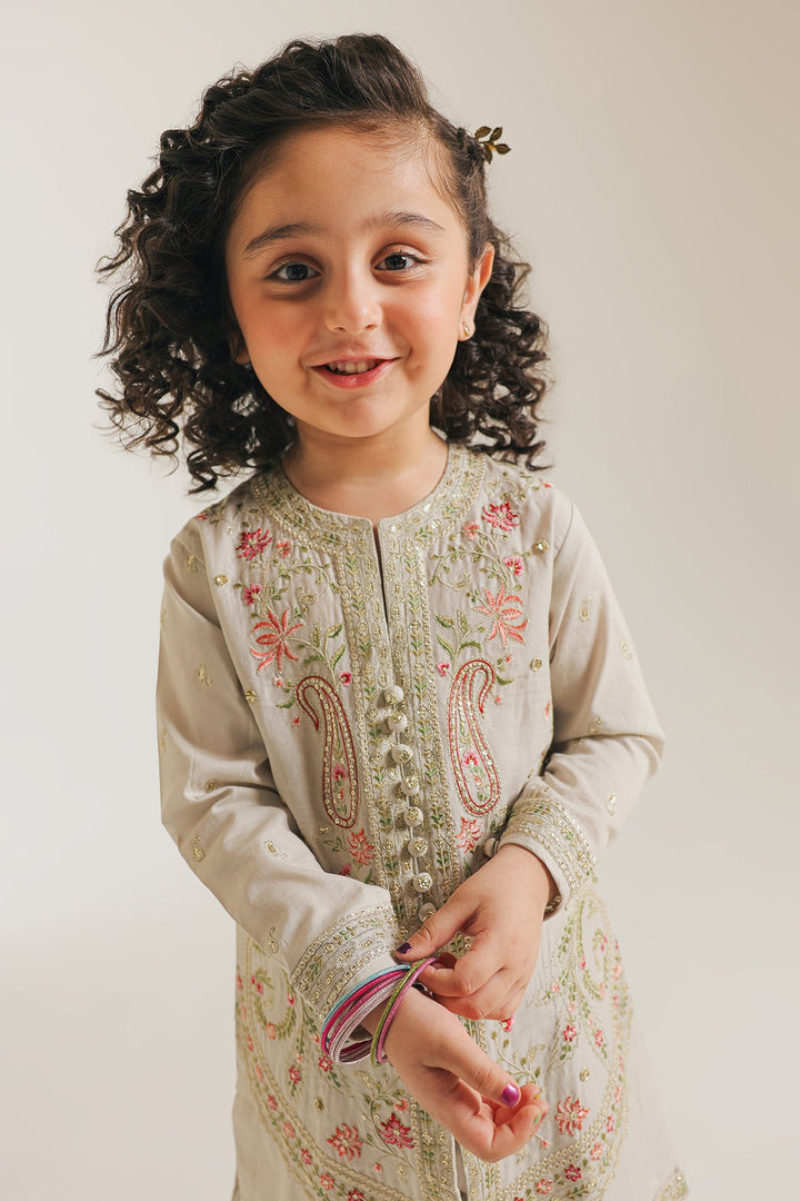 Adorn your little one in the delicate charm of our desert rose ensemble, a perfect blend of traditional elegance and modern comfort. This exquisite two-piece ensemble features a beautifully crafted kurta in a soft, neutral beige tone, reminiscent of desert sands. The long sleeves and comfortable fit ensure ease of movement for all her adventures. Delicate floral patterns in shades of pink, green, and red are intertwined with classic paisley motifs, creating a rich tapestry of color and texture. The unique front-open cut with stylish buttons adds a touch of classic sophistication. Paired with coordinating shalwar, this set is ideal for festive celebrations, family gatherings, or any occasion where graceful style is desired. Let her radiate timeless beauty in this enchanting outfit.