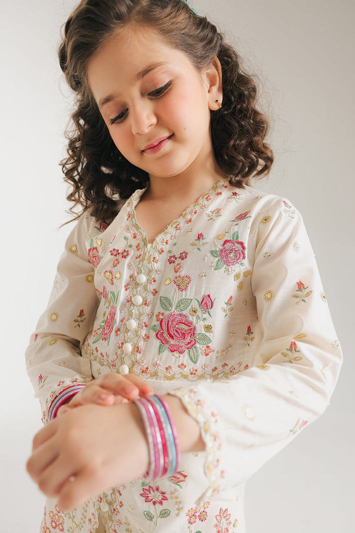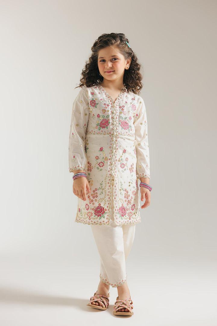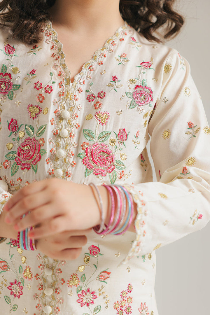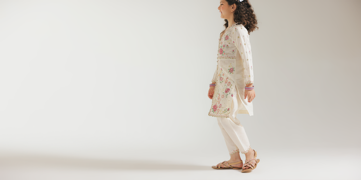 Discover a fusion of traditional and modern in this graceful outfit. Vibrant floral embroidery pops with sparkling embellishments on this chic shirt and complimented with an elegant embroidered shalwar. Perfect for girls' celebrations, embrace the exquisite craftsmanship and eye-catching colors.