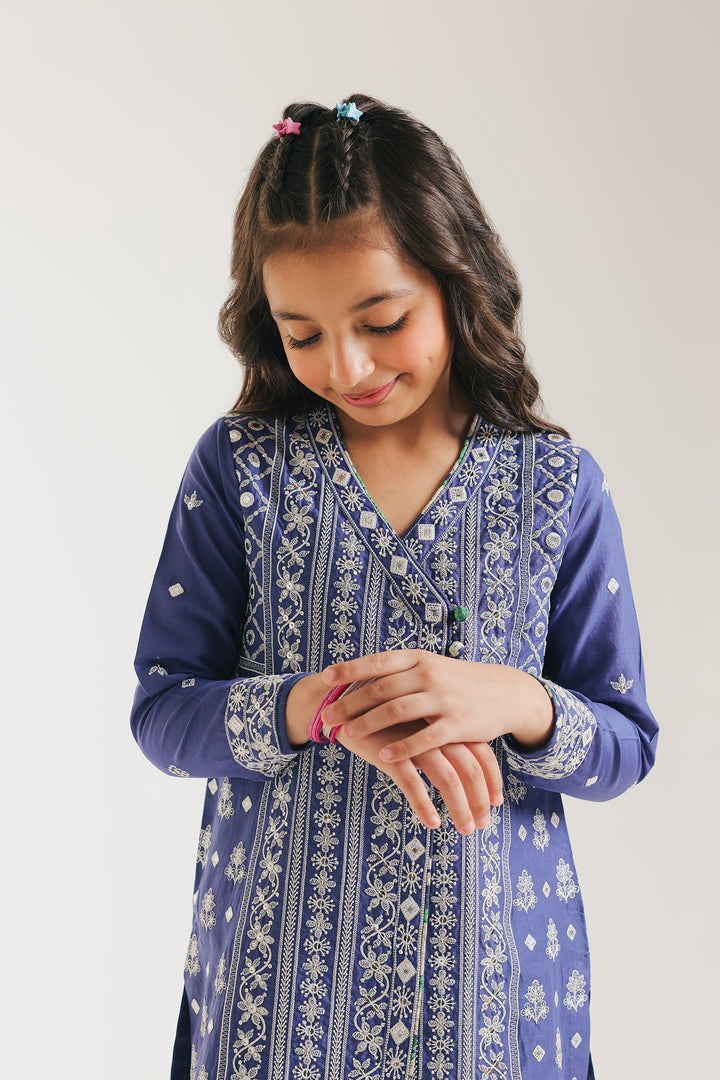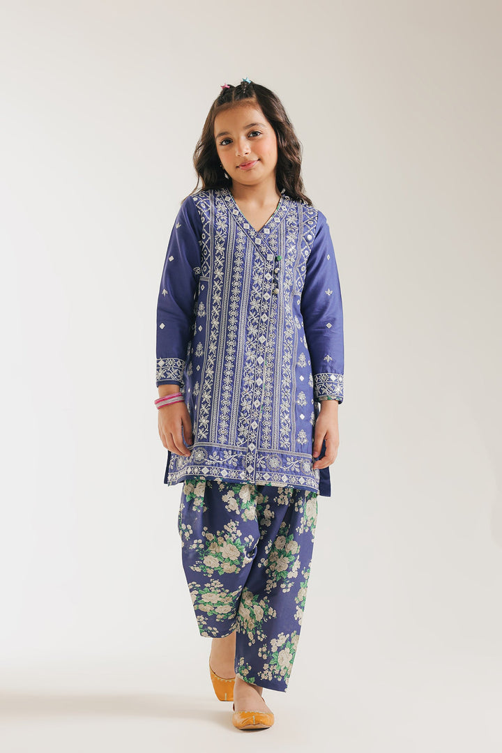 Elevate your little girls' festive wardrobe with this graceful outfit. Featuring a trendy silhouette, traditional design, and vibrant floral embroidery layered on an elegant indigo blue canvas, this outfit exudes elegance. Paired with a floral printed shalwar, it's a perfect choice for any special occasion.