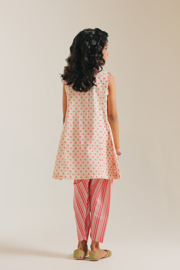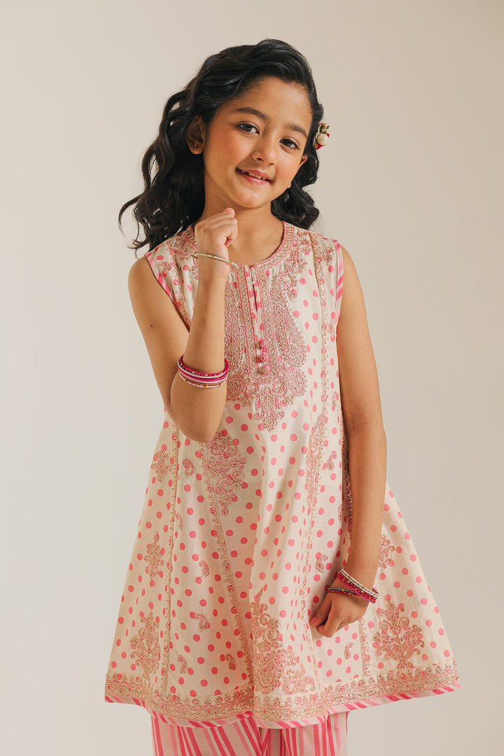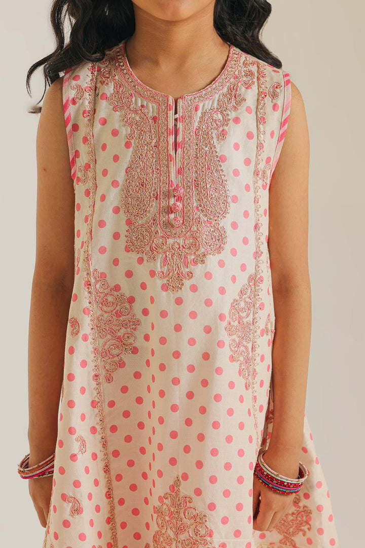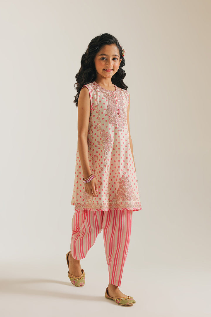 Dress your little one in this charming two-piece set, perfect for festive occasions or everyday elegance. This delightful ensemble features a sleeveless frock in a lovely off white base, adorned with delicate pink polka dots and intricate, swirling floral embroidery, creating a sweet and traditional look. The embroidery adds a touch of sophistication to the playful print, while the comfortable silhouette is designed for ease of movement. Completing the outfit is vibrant pink and white striped shalwar, offering a stylish contrast and a cheerful aesthetic. Ideal for various occasions, from family gatherings to casual outings, this set beautifully blends traditional charm with a fun, modern twist.