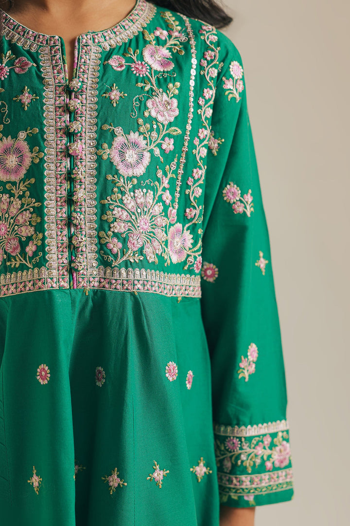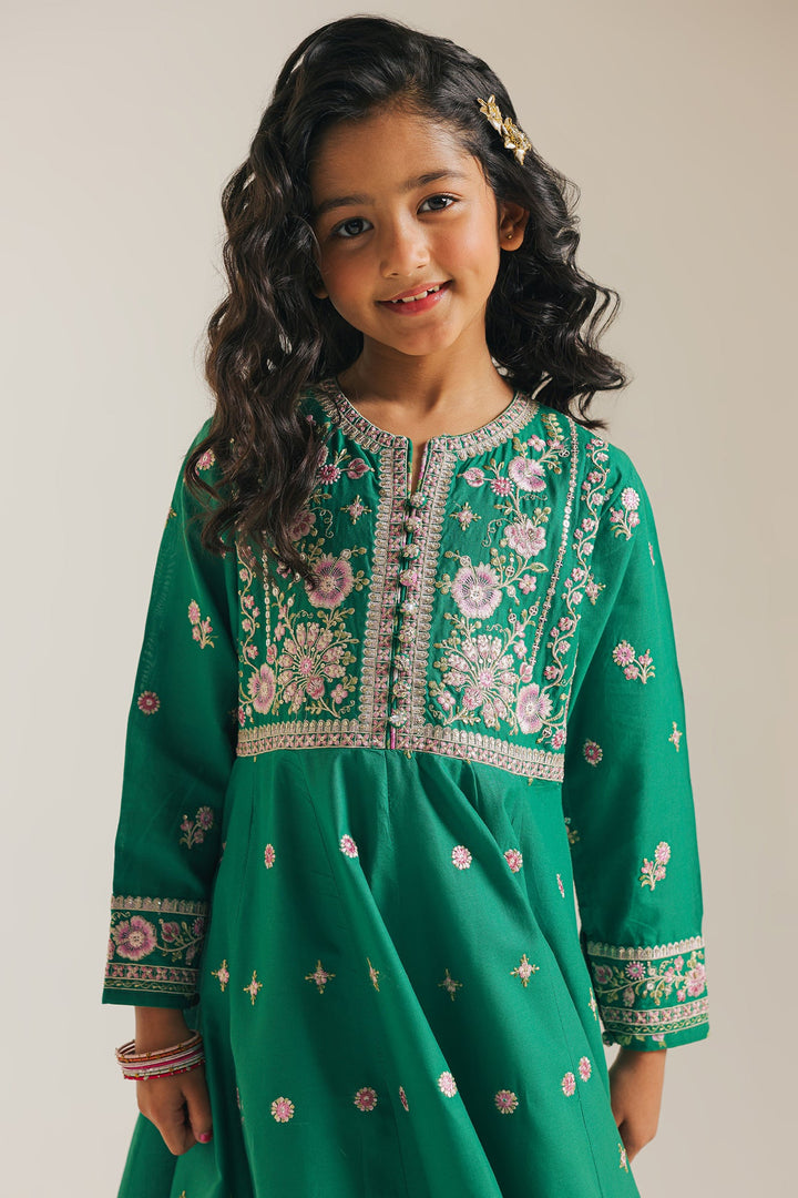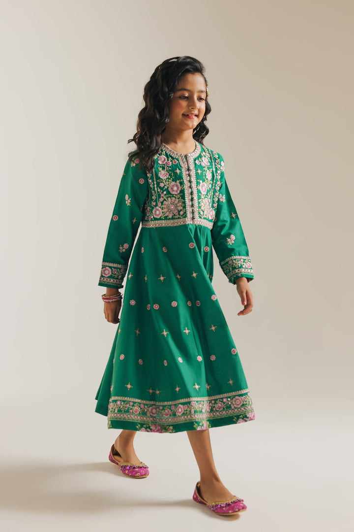 Immerse your little one in the vibrant charm of our emerald green pishwas, a truly enchanting dress designed to capture hearts. The long, flowing silhouette and full sleeves offer both elegance and comfort, perfect for delightful twirls and joyous celebrations. The bodice, sleeves, and hem are exquisitely adorned with intricate embroidery in delicate shades of pink, white, and gold, featuring charming floral and geometric patterns that add a touch of traditional artistry and captivating detail.