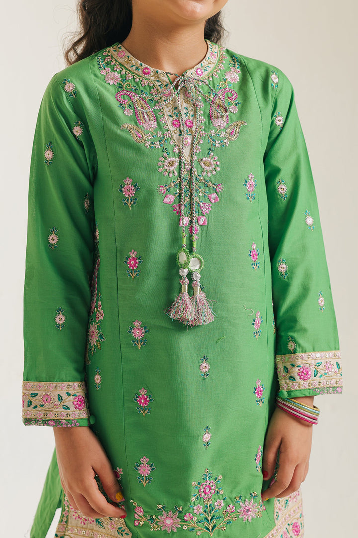 Dress your little star in the vibrant allure of this stunning green shalwar kameez, perfect for adding a pop of color and traditional elegance to any celebration. The rich emerald green fabric serves as a beautiful canvas for the intricate embroidery, blossoming in delicate shades of pink, white, and gold around the neckline, sleeves, and shirt hem. Charming tassels add a playful touch to the intricate neckline design. Paired with a comfortable, printed shalwar featuring complementary motifs, this ensemble offers both traditional grace and ease of movement for your little one. Ideal for festive occasions, family gatherings, or simply embracing cultural style with a cheerful spirit.