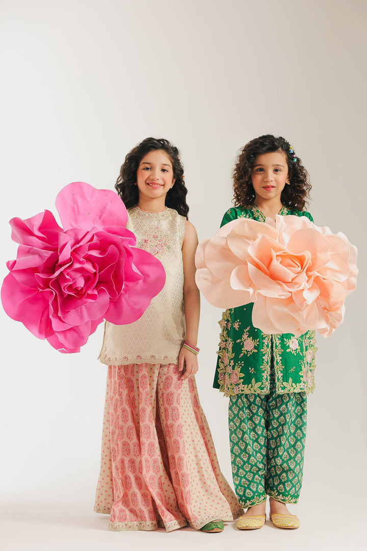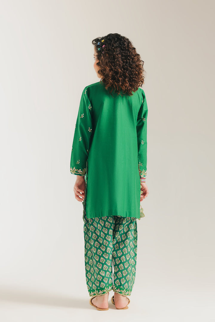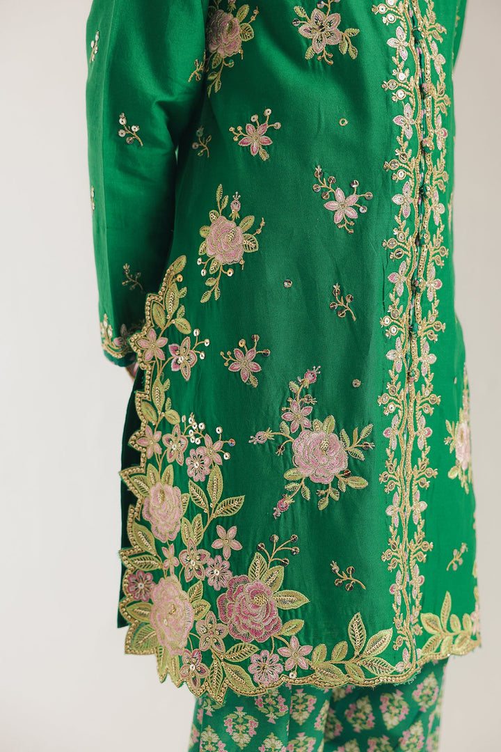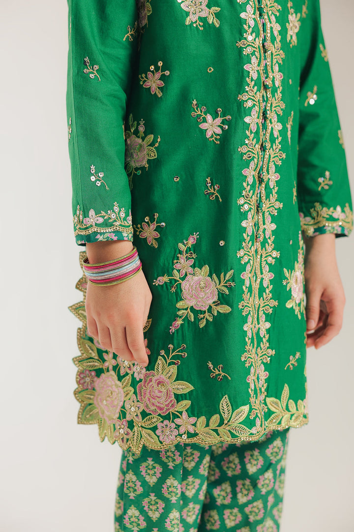 Adorn her in this vibrant green embroidered suit. This beautiful two-piece set features a kurti with intricate floral embroidery and shimmering embellishments around the neckline, creating a sophisticated and festive look. The suit is completed with matching printed shalwar with embroidered hem, making it a perfect ensemble for a special occasion or a celebration.