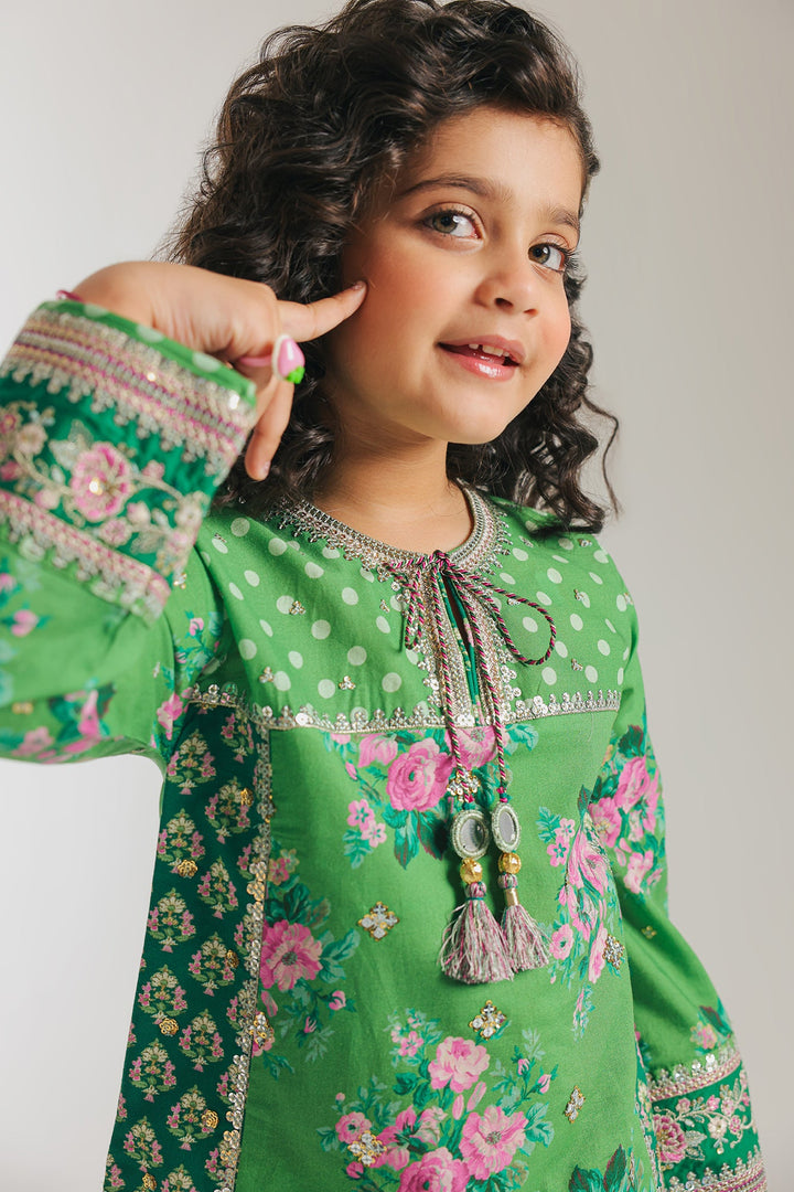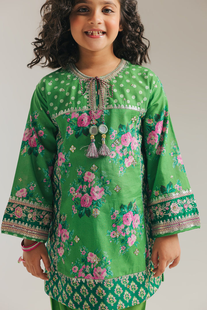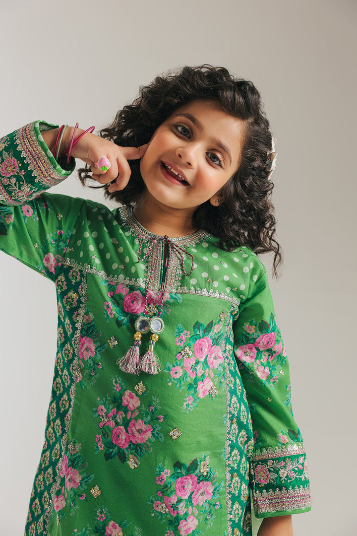Let your little one shine in this vibrant green outfit, bursting with playful polka dots and charming pink florals. Designed for comfort and joy, the cheerful shirt features delightful details, perfectly paired with matching shalwar. It's an ideal choice for endless smiles and festive fun, keeping them comfortable and stylish all day.