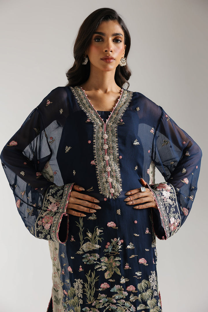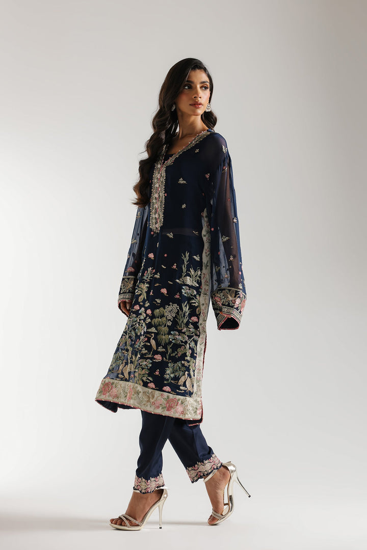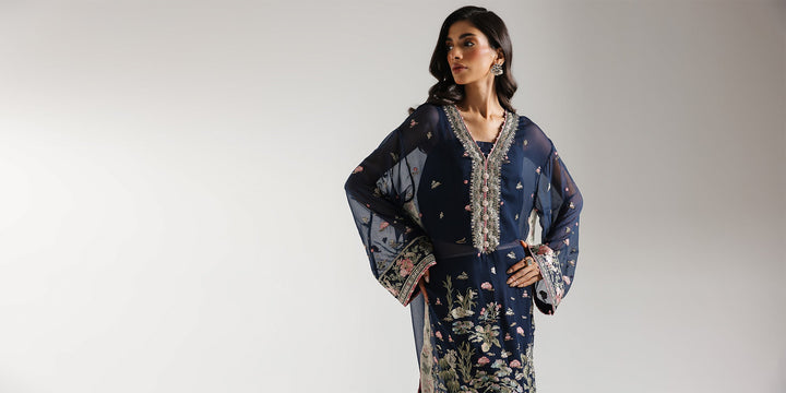 A classically chic composition is portrayed on this style statement outfit rendered in a deep blue shade. It features a contemporary chiffon shirt beautifully adorned with aesthetically rich embroidery in mesmerizing colors illustrating beautiful floral design and enhanced with delicate embellishments. The shirt comes attached with a slip and is paired with an embroidered shalwar. This scintillating outfit is a perfect option to look graceful this festive season.