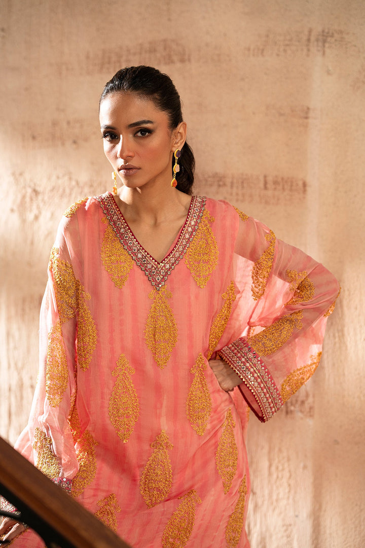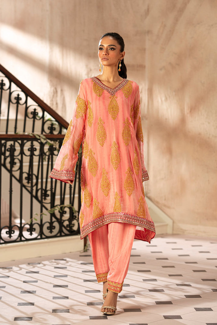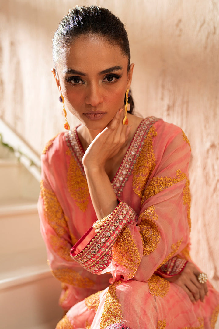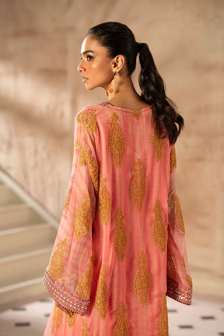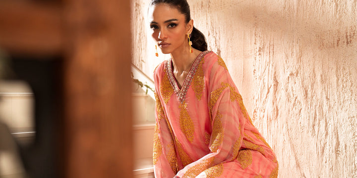 The style statement exudes elegance with its timeless design. The chiffon shirt in a beautiful baby coral hue is intricately embellished with enchanting embroidery in stunning mustard colors and enhanced with intricate borders. Paired with an inner slip and a classy shalwar adorned with exquisite embroidery, this outfit is perfect for a graceful and stylish look this festive season.