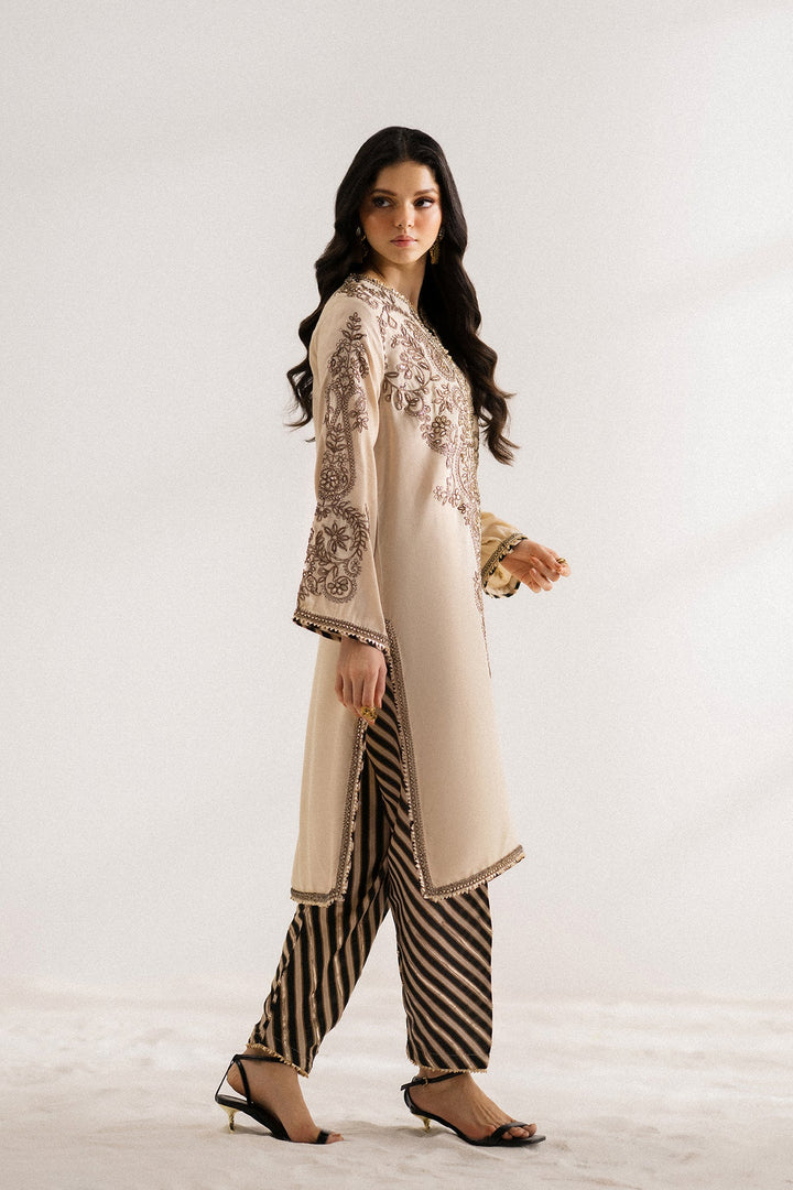 Command attention with this exquisitely crafted two-piece ensemble, blending traditional artistry with striking modern design. The sophisticated beige kurta is richly adorned with intricate, tone-on-tone embroidery featuring elaborate floral and medallion motifs that cascade across the front and sleeves. Paired with chic striped shalwar showcasing a bold, contrasting dark brown and beige pattern, this outfit creates a distinctive and stylish silhouette. Perfect for making an unforgettable statement at festive occasions, formal gatherings, or sophisticated events.