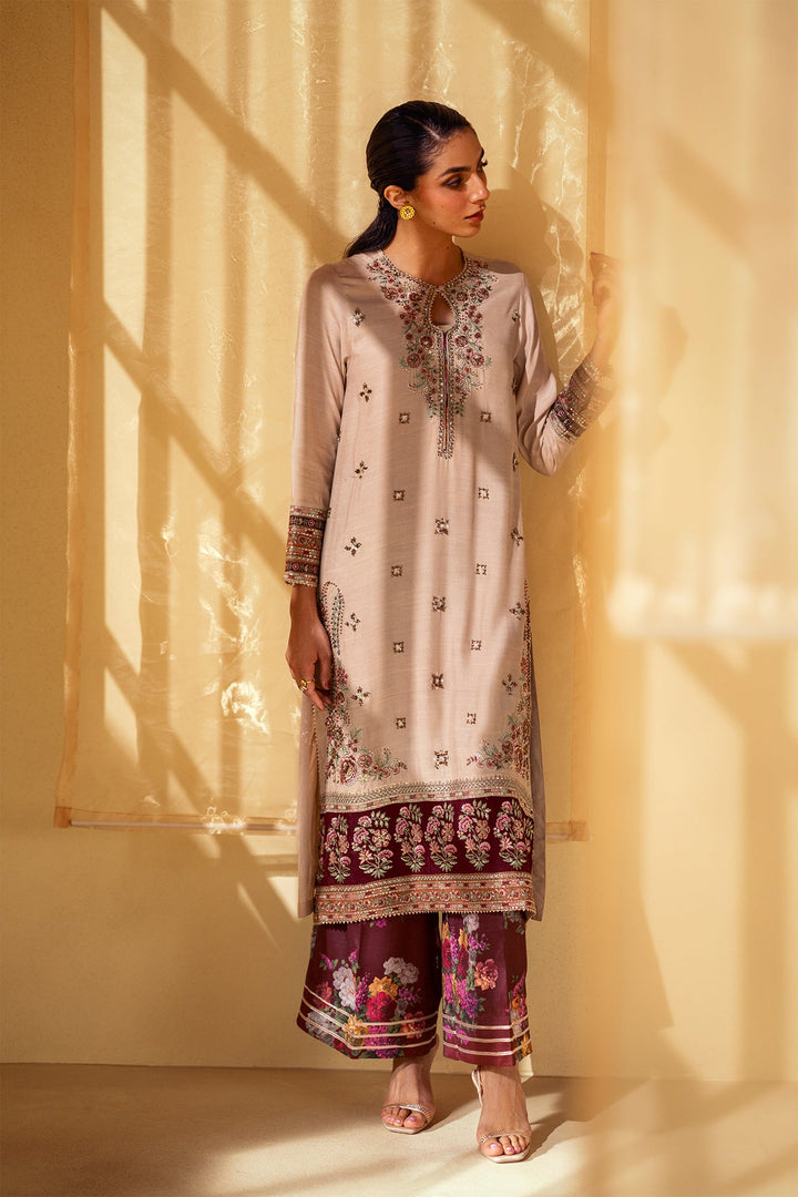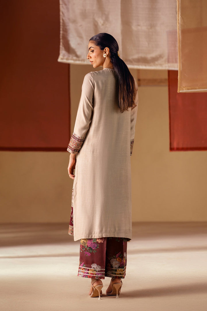Experience the captivating fusion of rustic elegance and artistic detail. This stunning embroidered suit features a light, beige shirt adorned with intricate floral embroidery and shimmering sequin details on the front. The look is completed with wide-leg trousers that showcase a bold, colorful print in deep maroon and terracotta hues. This ensemble is a perfect blend of modern sophistication and timeless artistry, making it a truly unique statement piece.
