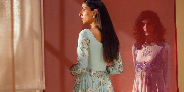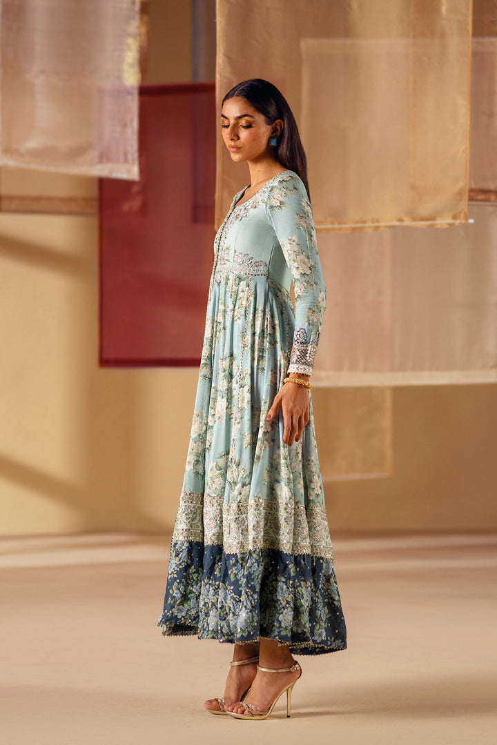 Step into a fairytale of serene grace. This beautiful pishwas and flapper suit features a light, seafoam-blue fabric with a graceful, flowing silhouette. The bodice is adorned with intricate embroidery in soft gold, while the voluminous skirt and flapper trousers are finished with a stunning, contrasting dark blue floral border. This ensemble is a perfect blend of timeless elegance and modern design, making it a captivating choice for any special event.
