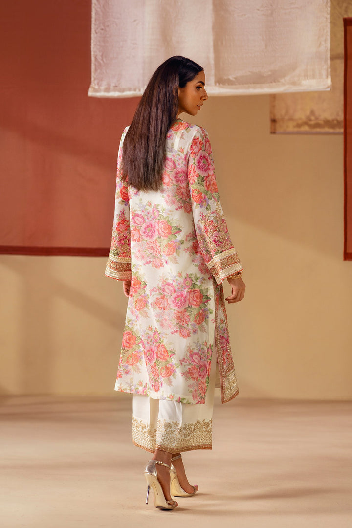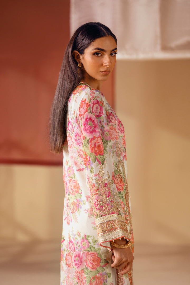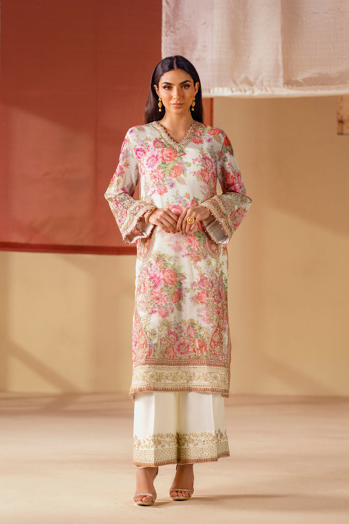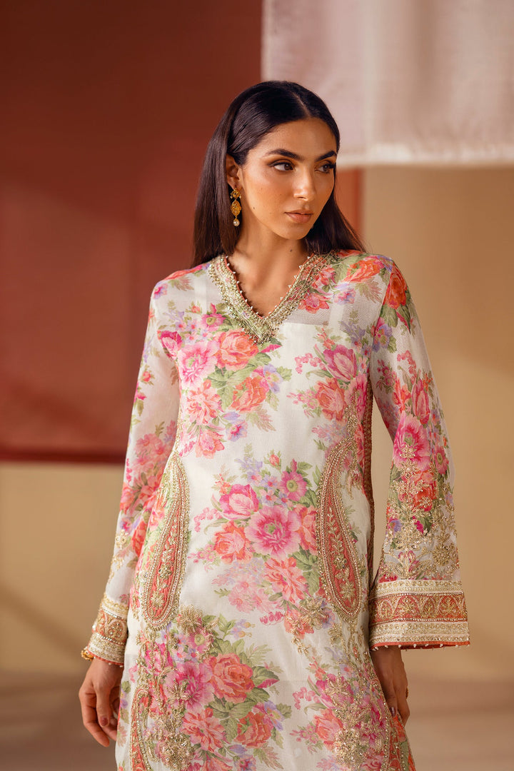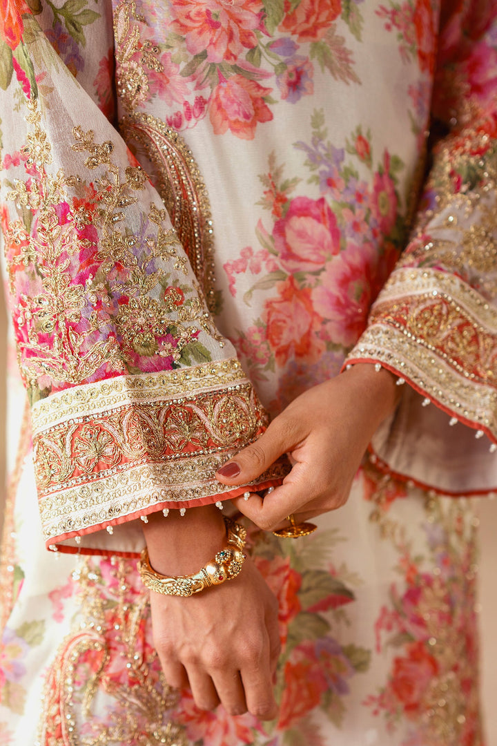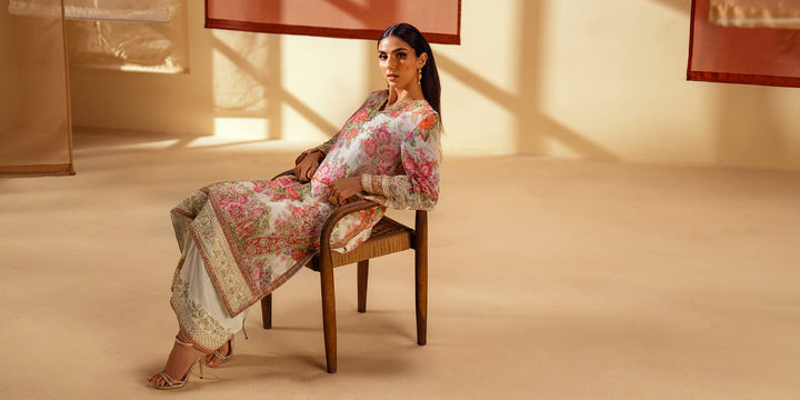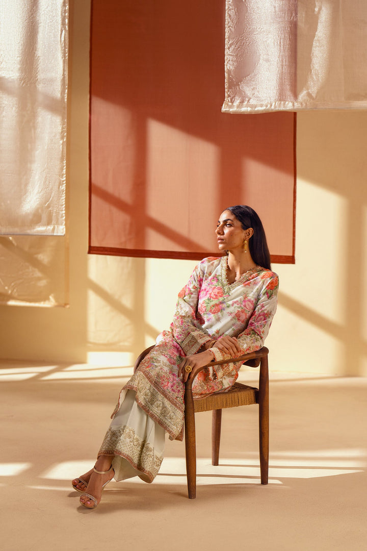 Dive into a garden of graceful beauty. This 3-piece suit features a sleeveless inner slip and a beautiful, long shirt with intricate floral embroidery and print in shades of soft pink, red, and sage green. The flapper-style trousers are adorned with a matching floral border at the hem, creating a cohesive and sophisticated look. The ensemble is a perfect blend of modern style and timeless artistry, making it an ideal choice for a special occasion.