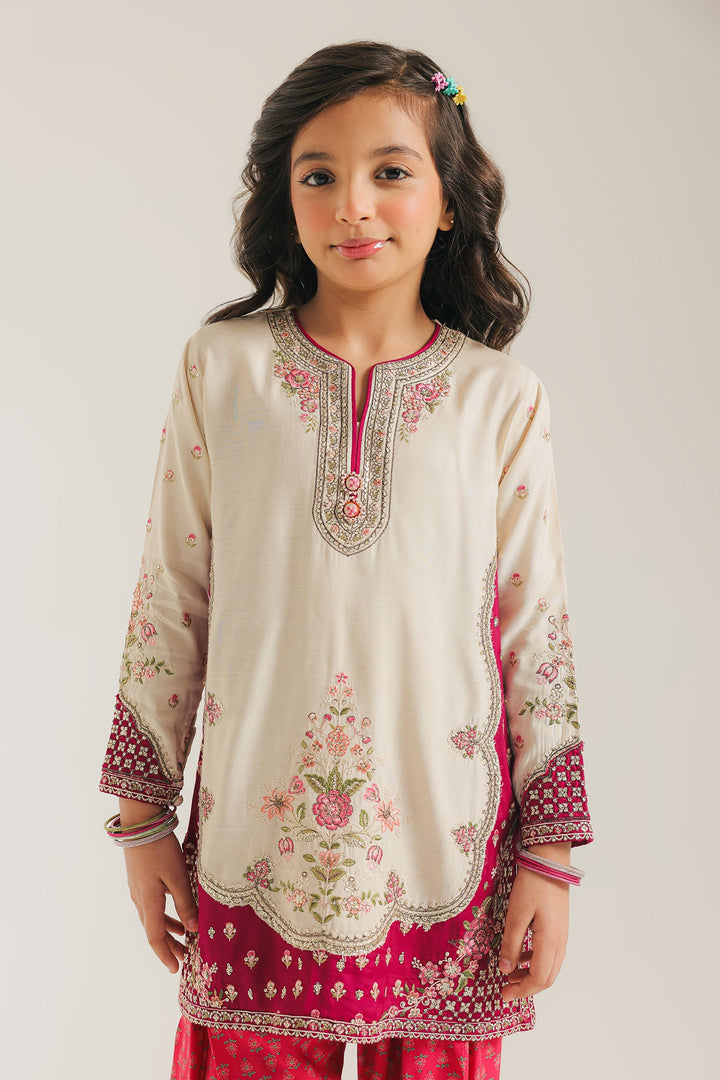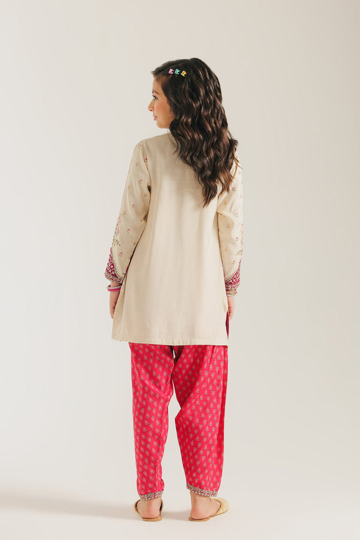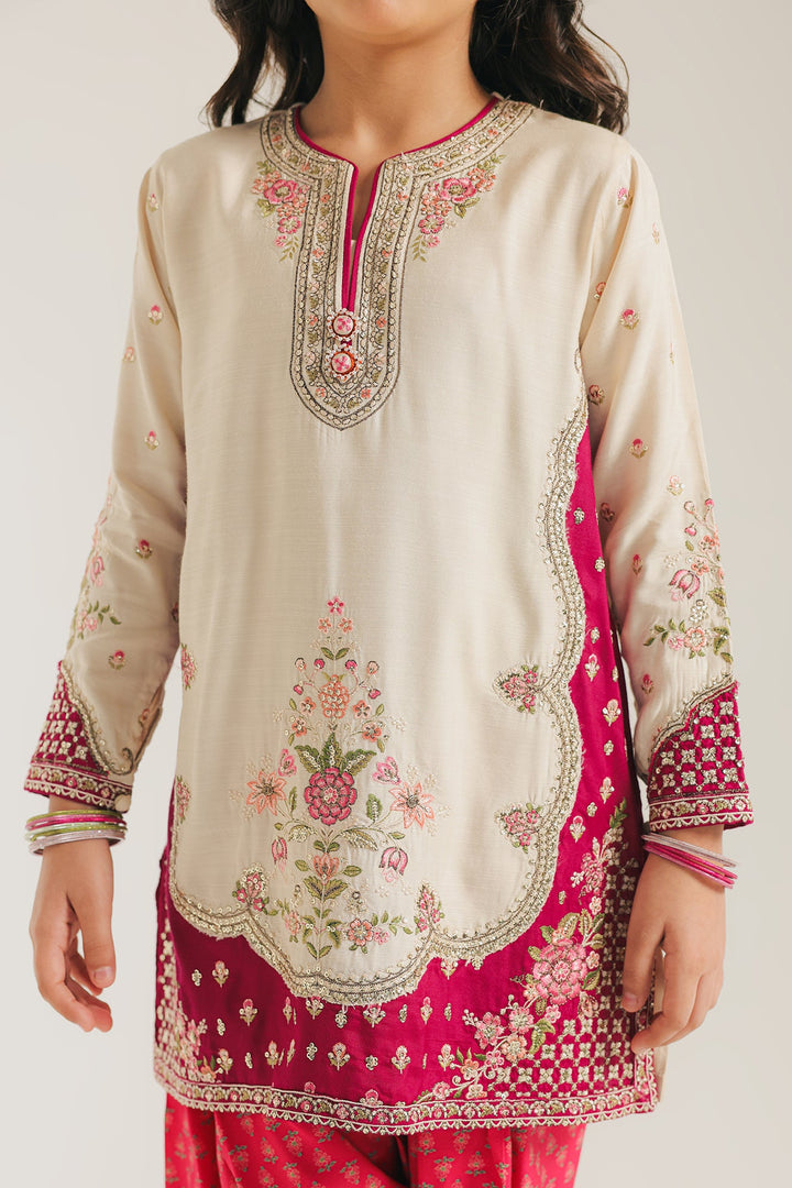 Add a vibrant touch to her wardrobe with this charming embroidered suit. The off-white kurta features a beautiful panel design with intricate floral and vine embroidery in rich magenta and pink hues, creating a stunning visual contrast. Paired with a bold magenta shalwar that has a delicate all-over print, this suit is a fun and eye-catching ensemble, perfect for any special day.