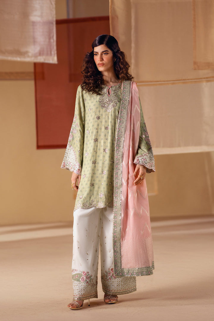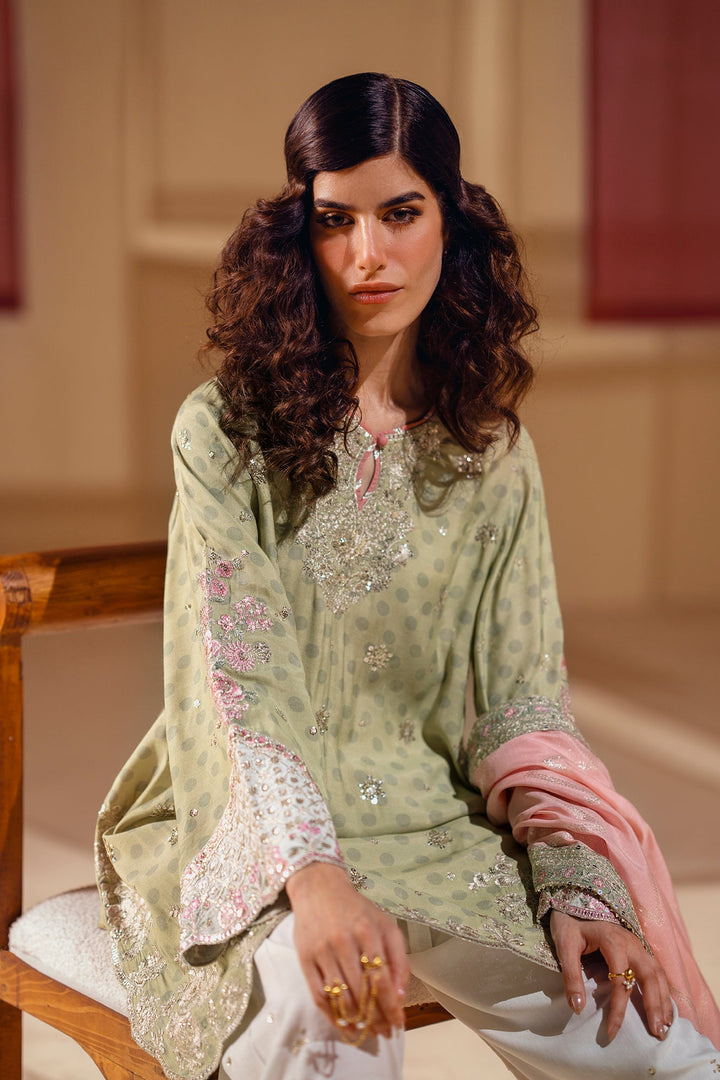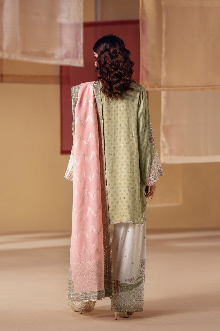A vision of sophisticated artistry. This stunning 3-piece suit includes a beautiful light green shirt, a farshi shalwar, and a matching dupatta. The shirt is adorned with delicate embroidery and subtle polka dots, while the farshi shalwar features a bold, embroidered border with intricate floral patterns. The look is completed with a soft pink dupatta that is gracefully embellished with an ornamental zig-zag pattern. This ensemble is a celebration of elegant contrasts and timeless design, perfect for a grand occasion.