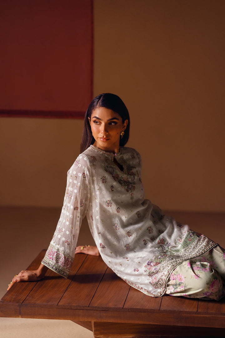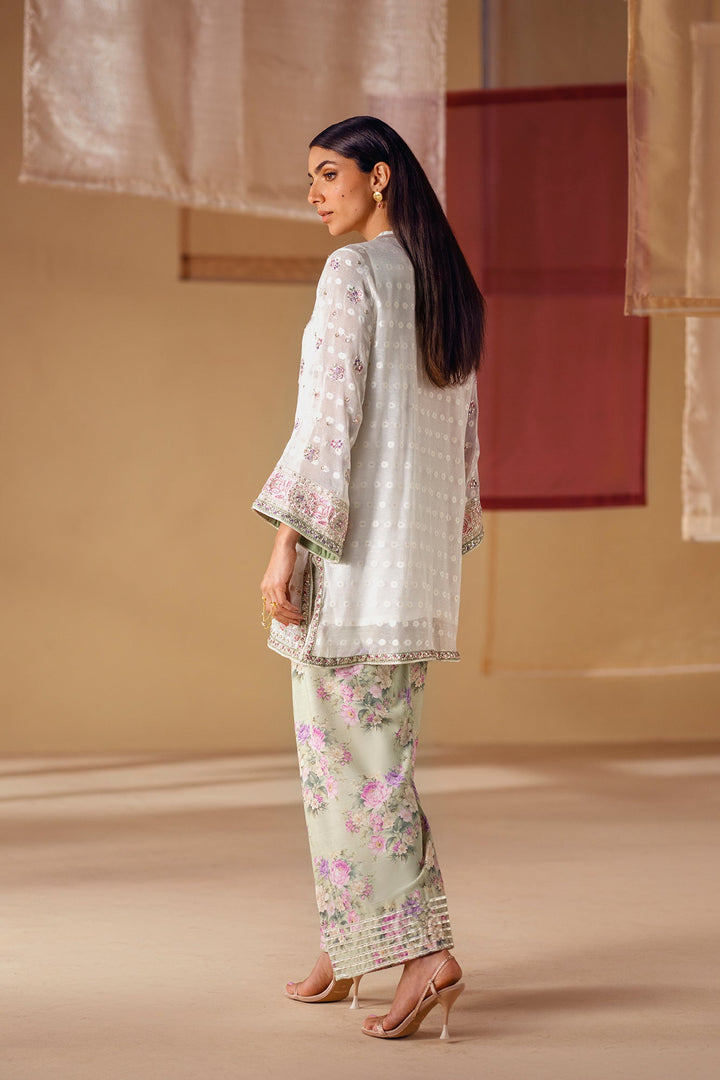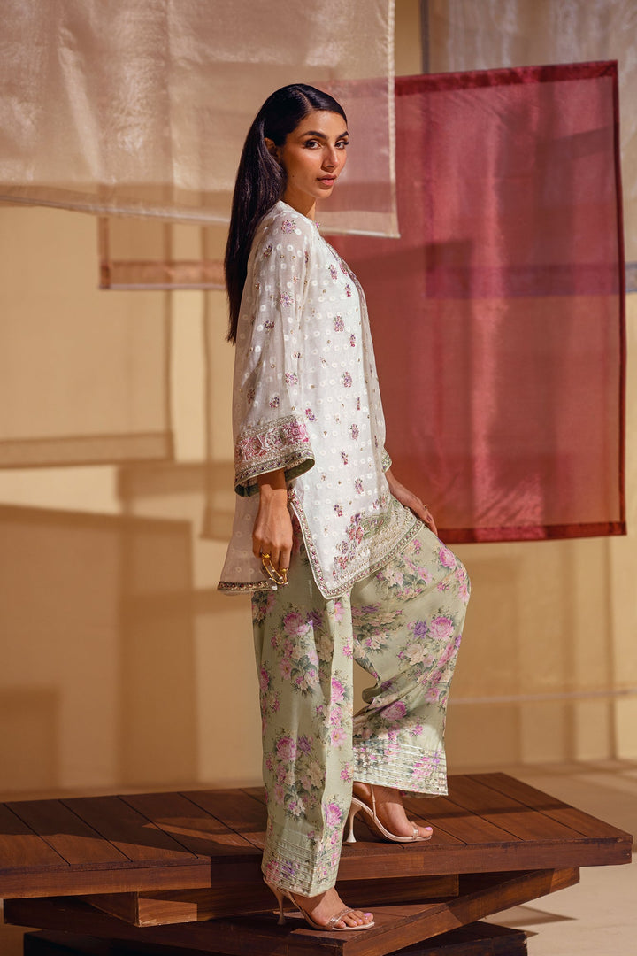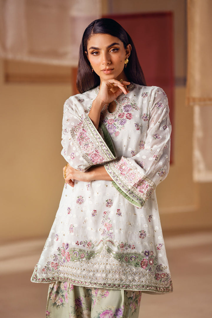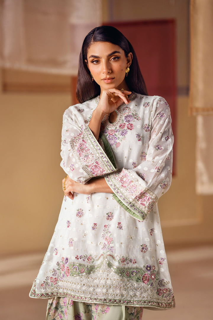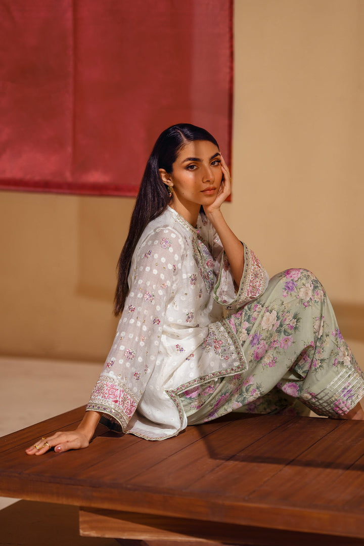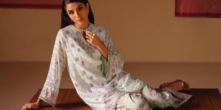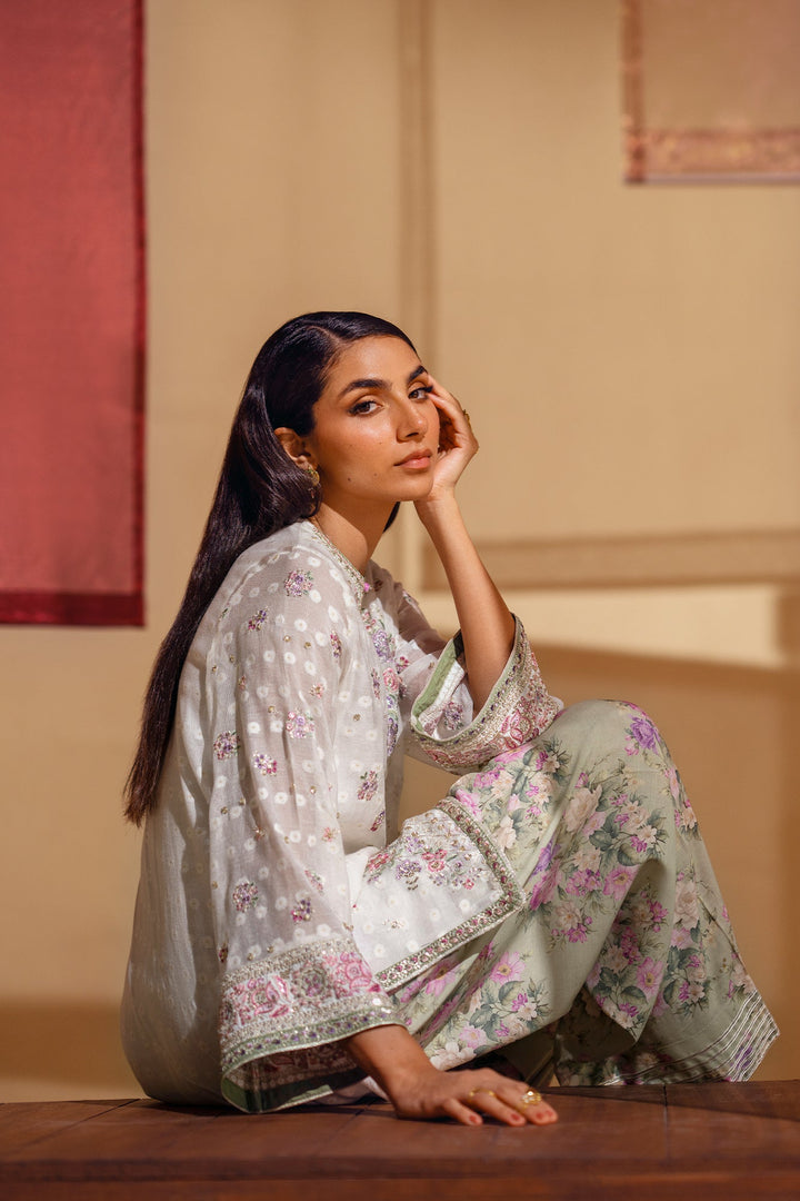 A vision of delicate elegance and artistic charm. This 3-piece suit includes a beautiful off-white shirt with intricate floral embroidery in soft pink and green hues. The look is completed with an inner slip and a farshi shalwar in a serene sage green, adorned with a graceful floral print and a stunning embroidered border. This ensemble is a perfect blend of timeless romance and modern style.